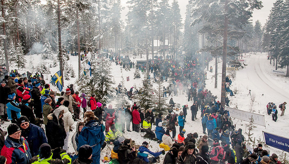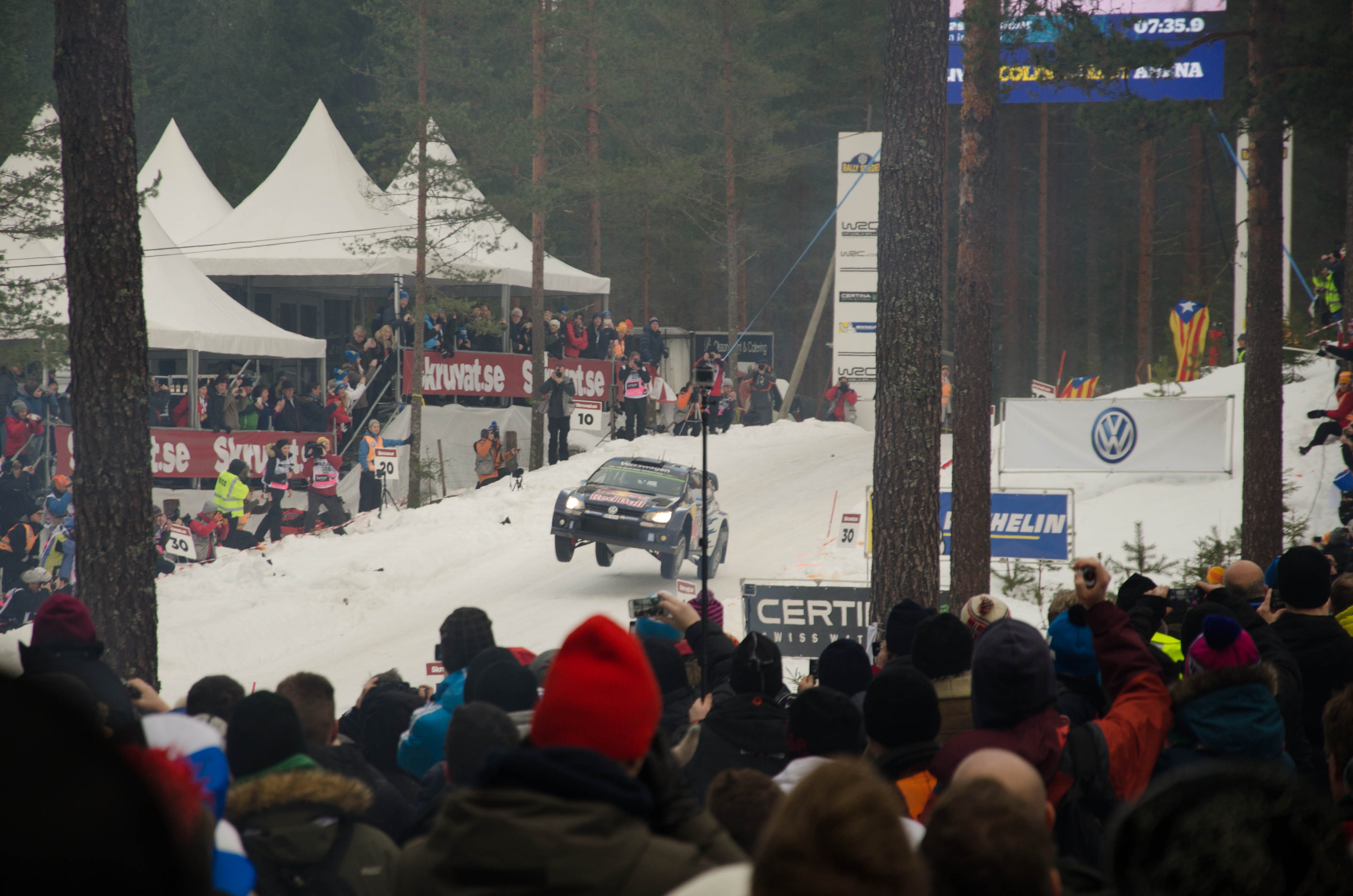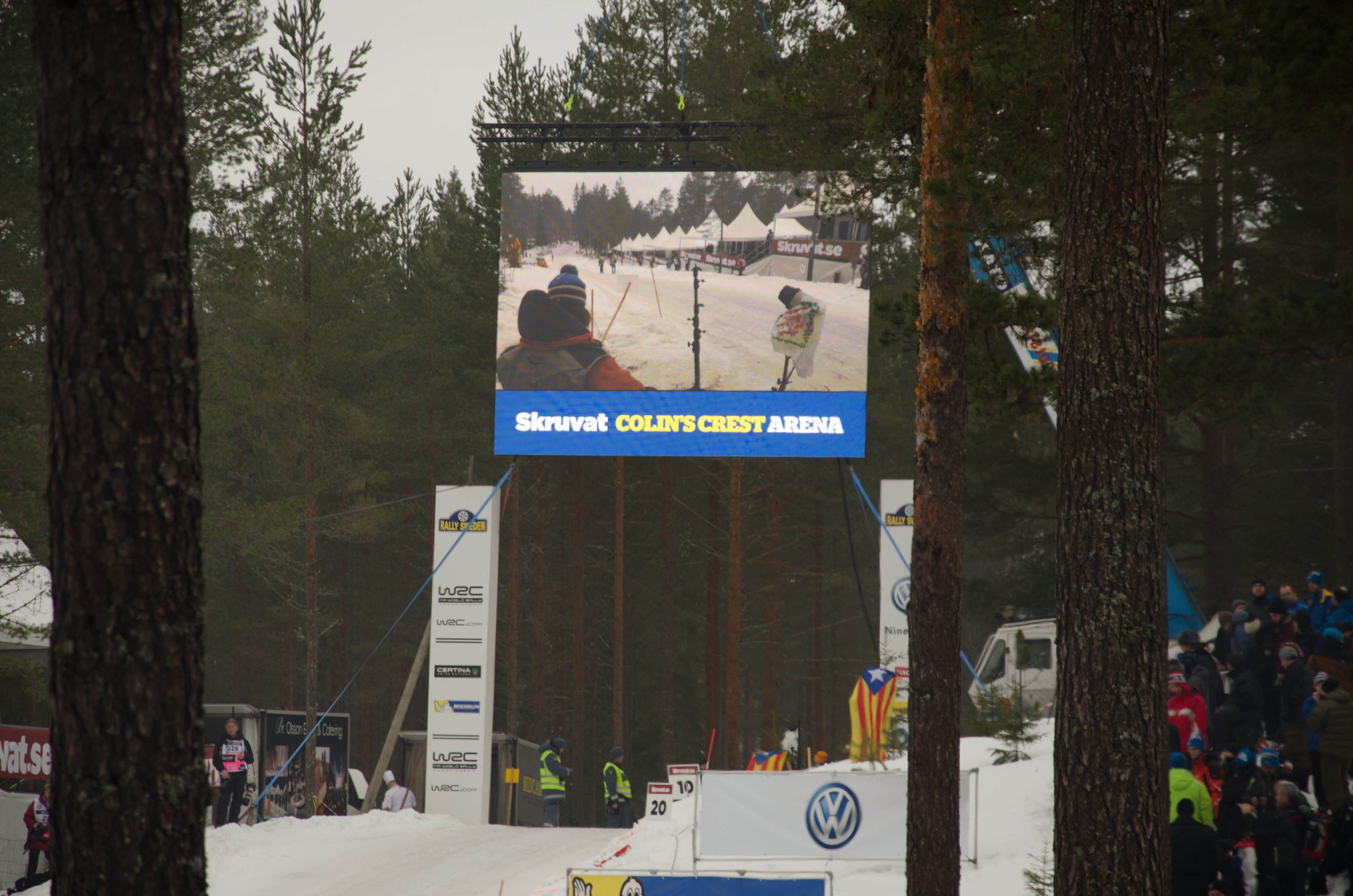 Väl inne på området börjar man inse galenskapen i det hela. Här får man samsas med ca 10 000 andra som kommit hit för att njuta av en trevlig dag i skogen med rallyentusiaster från stora delar av Europa. Med Skruvat som sponsor hade man på ena sidan av vägen byggt upp et VIP område med paviljonger och rakt över krönet hänger det en storskärm i en stor mobilkran. Här kan man följa rallysträckorna före SS14, vargåsen, som är den sträckan Colin´s Crest ligger på.