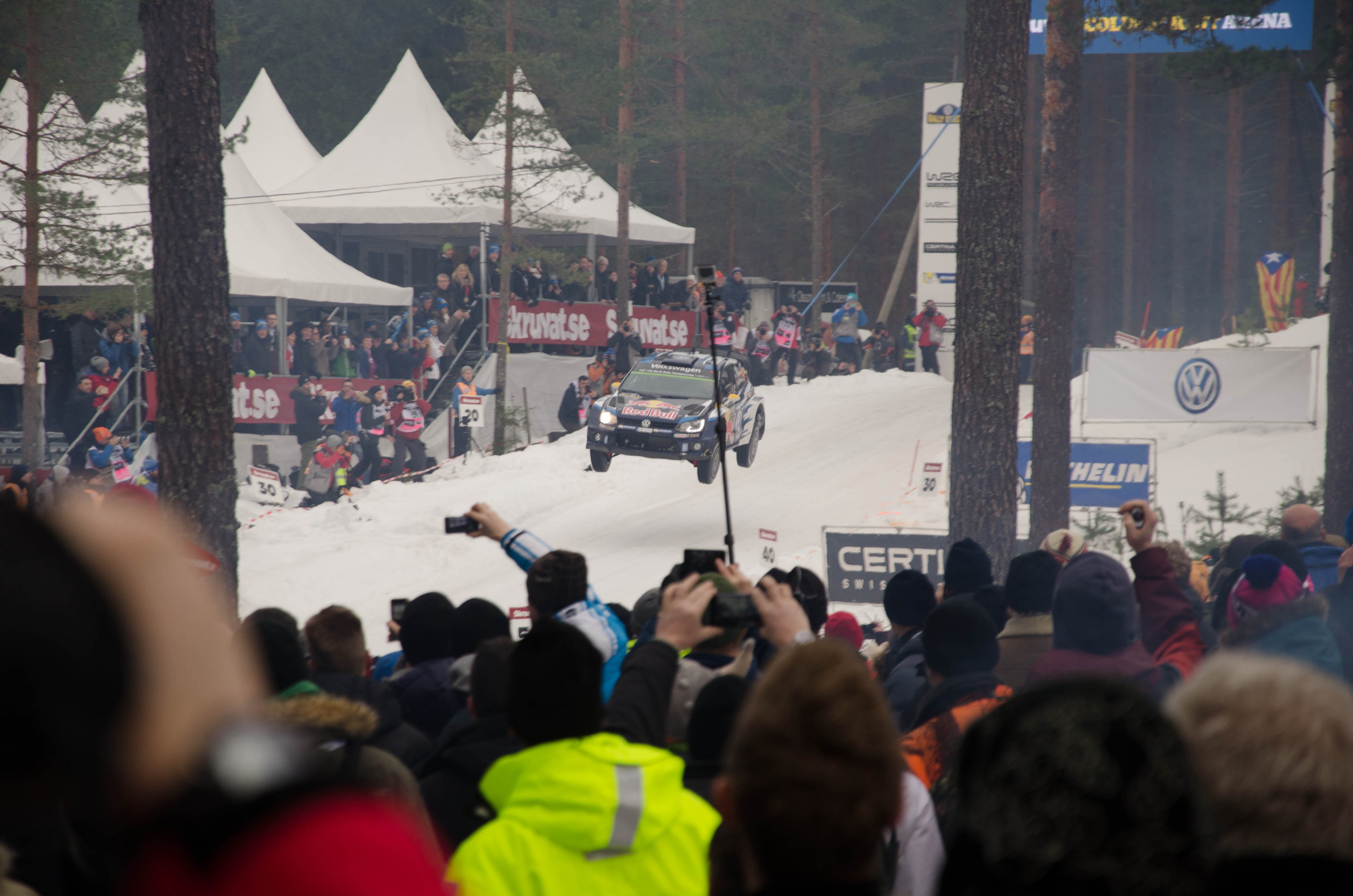 Efter en god Gulasch lunch och en öl i Volkswagen tältet började spektaklet när bilarna började närma sig krönet. Först ut var Sebastian Ogier som innehar hopp-rekordet över detta krön, 41 m. Men han fegade lite i år och kom ”bara” 35m.