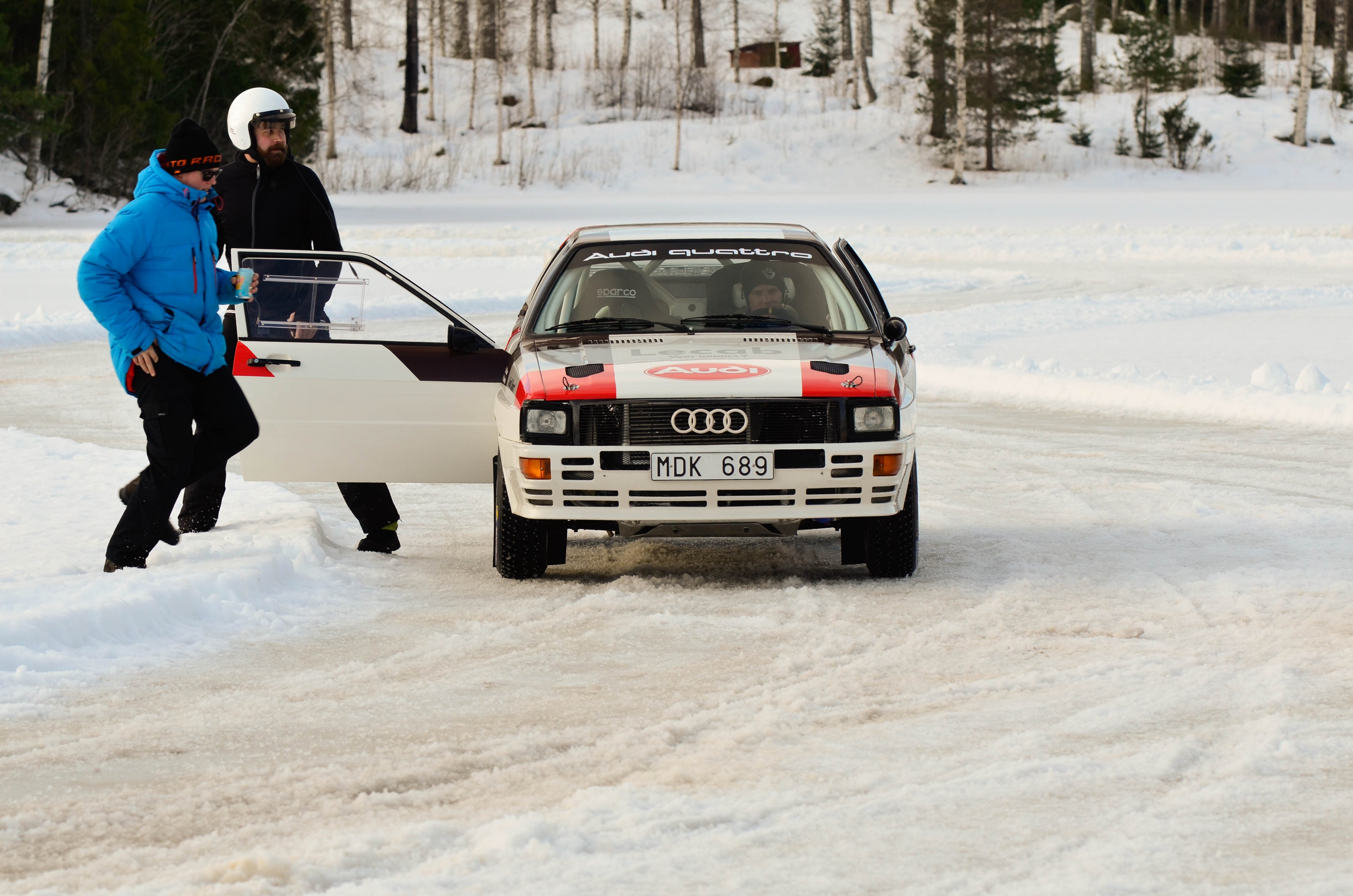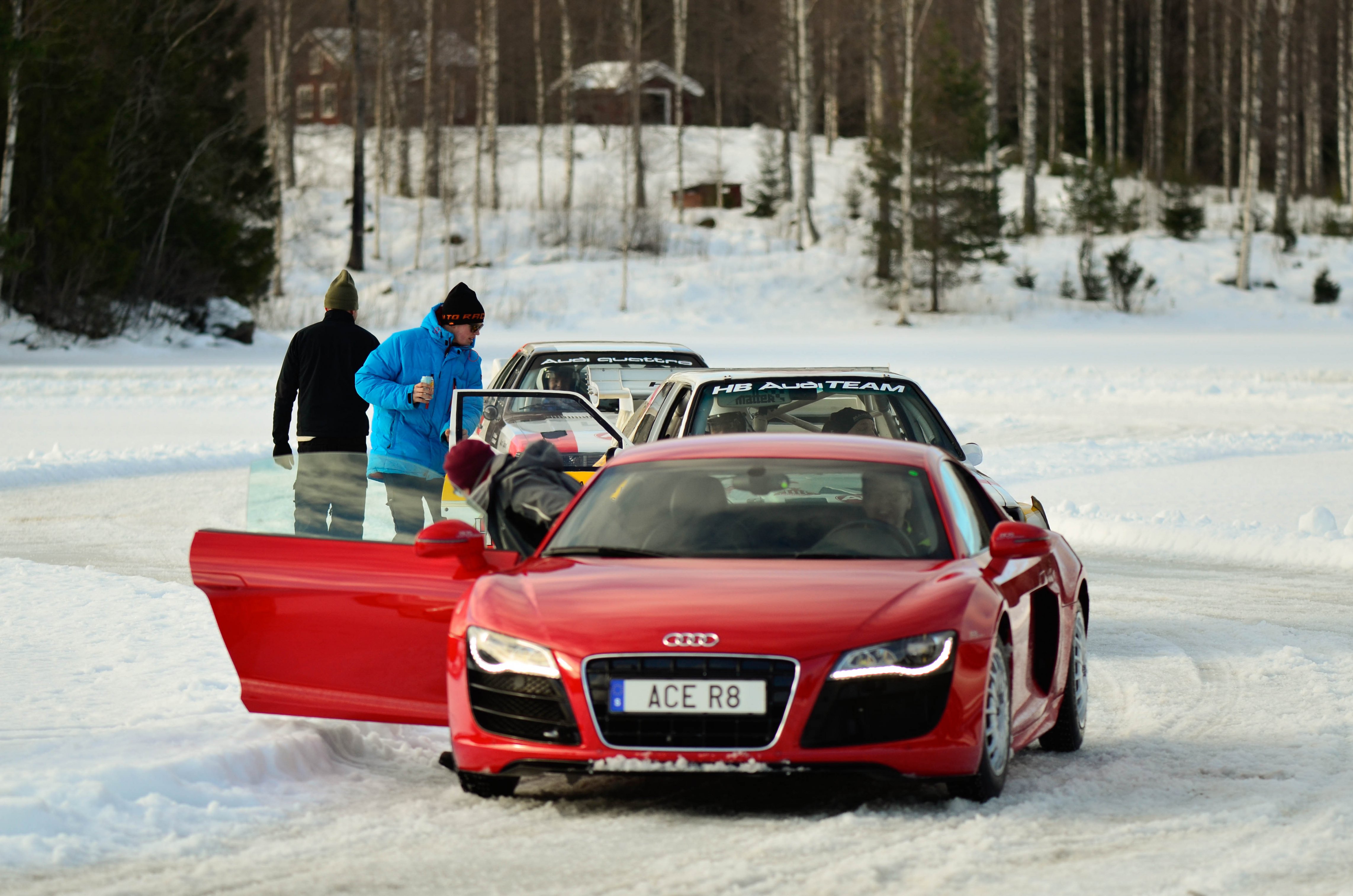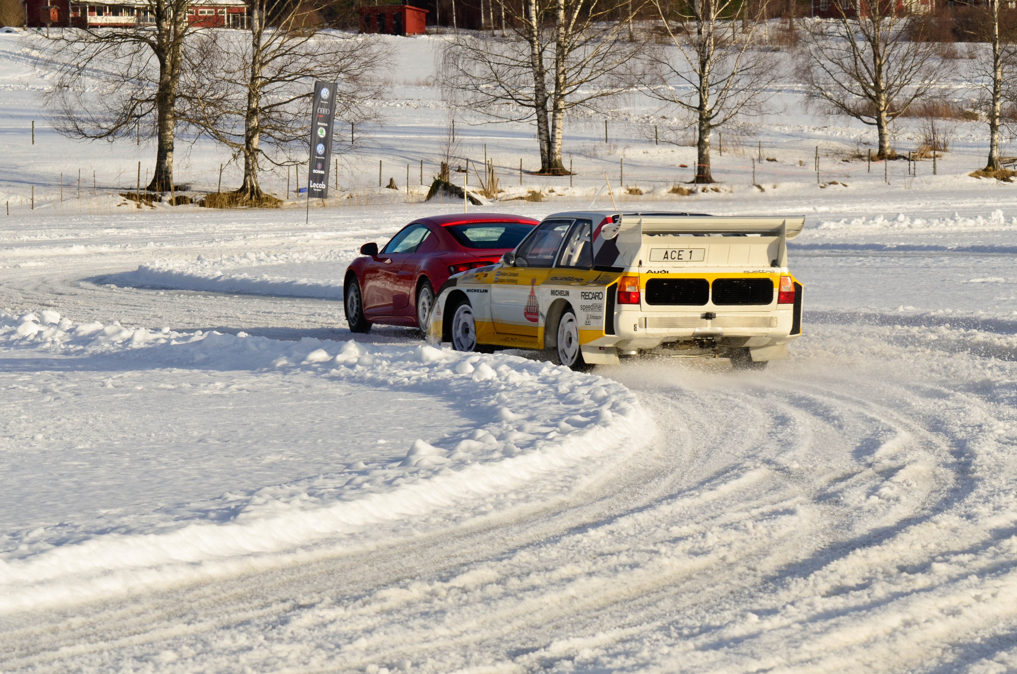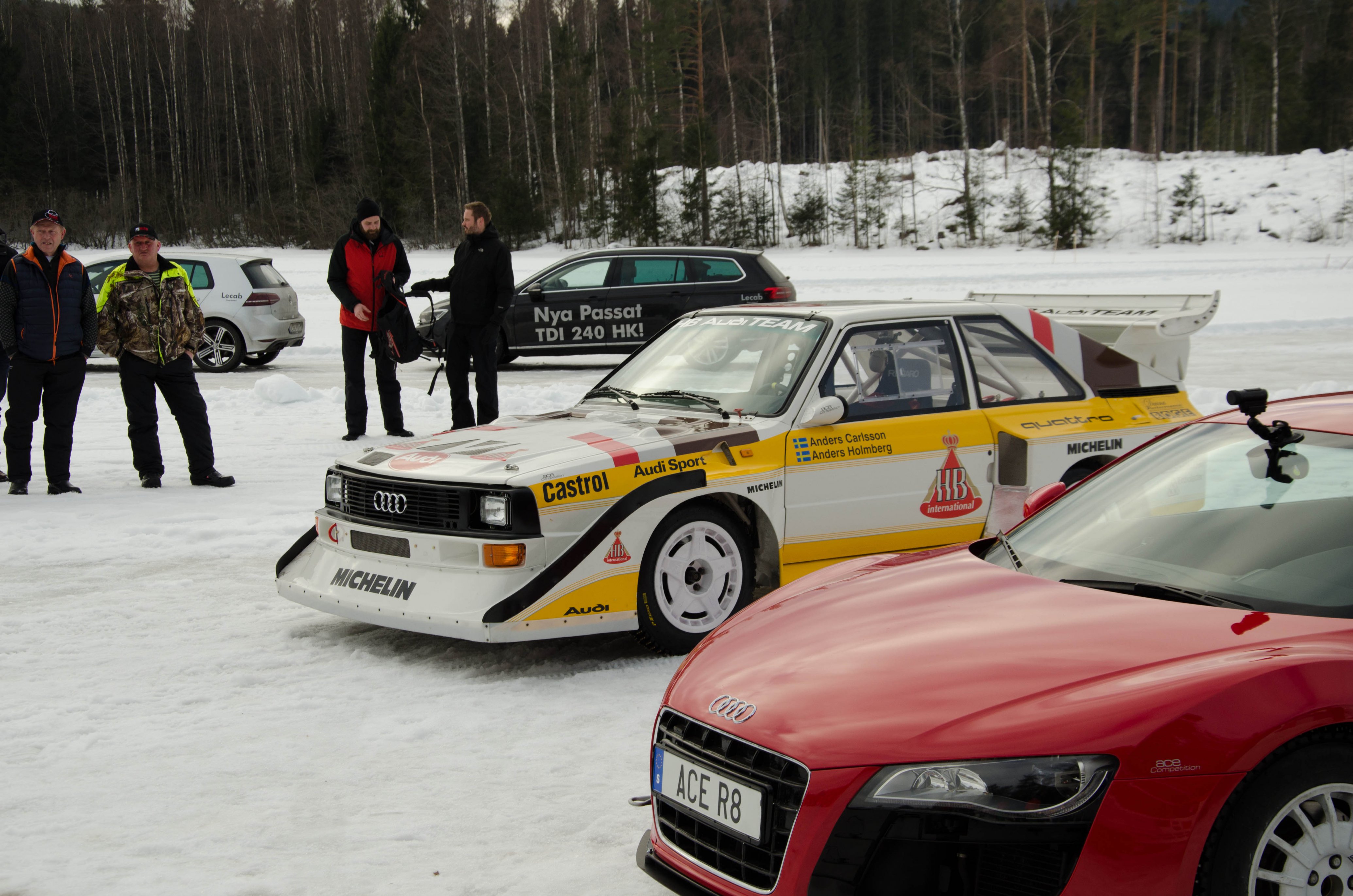 Efter att WRC bilarna hade kört sina åk och man börjat på WRC2 så var det dags att återvända till bussarna för att ta oss vidare upp till sjön Velen som ligger utanför byn Ganterud. Här var det plogat två banor ute på isen, en för medåkning och en för att själv kunna testköra med två olika bilar. Medåkningen stod Boråsfirman ACE-Competition för och här fans en Audi R8 V10, en Audi S1 UrQuattro och en Audi SportQuattro. Till rådighet för att själv testa på lite iskörning hade LECAB BIL ställt upp med en MK7 Golf R och en sprillans ny 240hk Passat 2.0 TDI DSG 4motion GTS sportcombi.