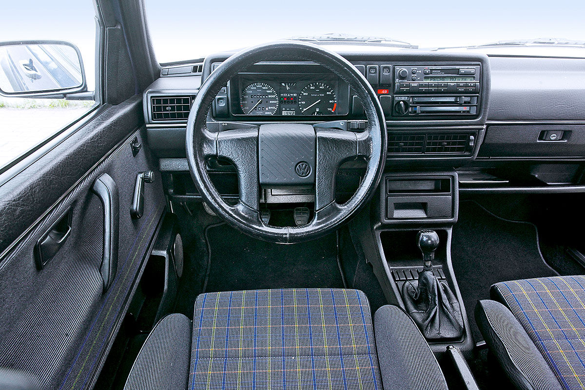 Zweckmäßig-funktional die weitere Ausstattung: Servolenkung, Sportsitze, elektrisch verstellbare Spiegel, Gamma-Radio mit Kassette. Fertig. Doch halt: Ein Dauerrot in der Instrumententafel verrät, dass die ABS-Bremse dieses G60 gelegentlich einer fachkundigen Überprüfung bedarf.