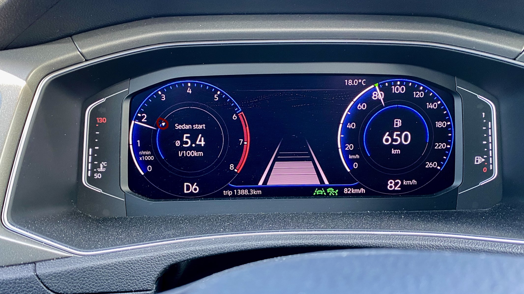 Om du ser på förra gen AID med samma vy (förbrukning och räckvidd) så visar blå cirkel på höger sida hur mycket bränsle som finns kvar. På vänster sida aktuell förbrukning, full cirkel > 2L/100km.
