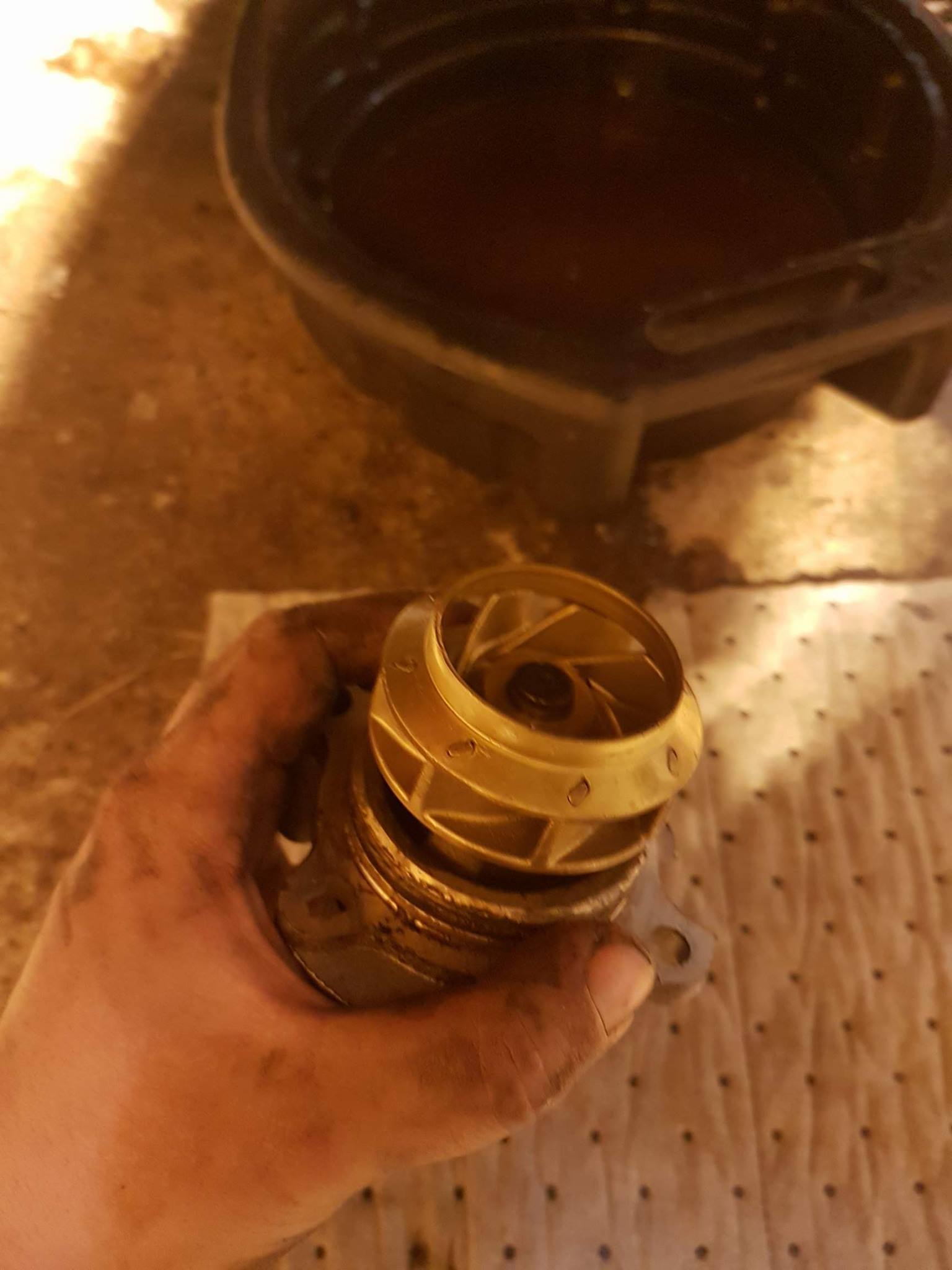 Gamla pumpen var som ny. Och med impeller i metall. Inte vad jag ville hitta, då var det bara luft i systemet kvar som anledning till att temperaturmätarna visade högt tänkte jag, och fortsatte med att fylla systemet igen. Provkörde bilen igen och fortfarande samma fenomen med hög temp på oljetempmätare i MFA och kylvätsketempmätare i klustret. Nu hade jag en sprillans ny vattenpump, ingen luft i systemet och inga läckor.