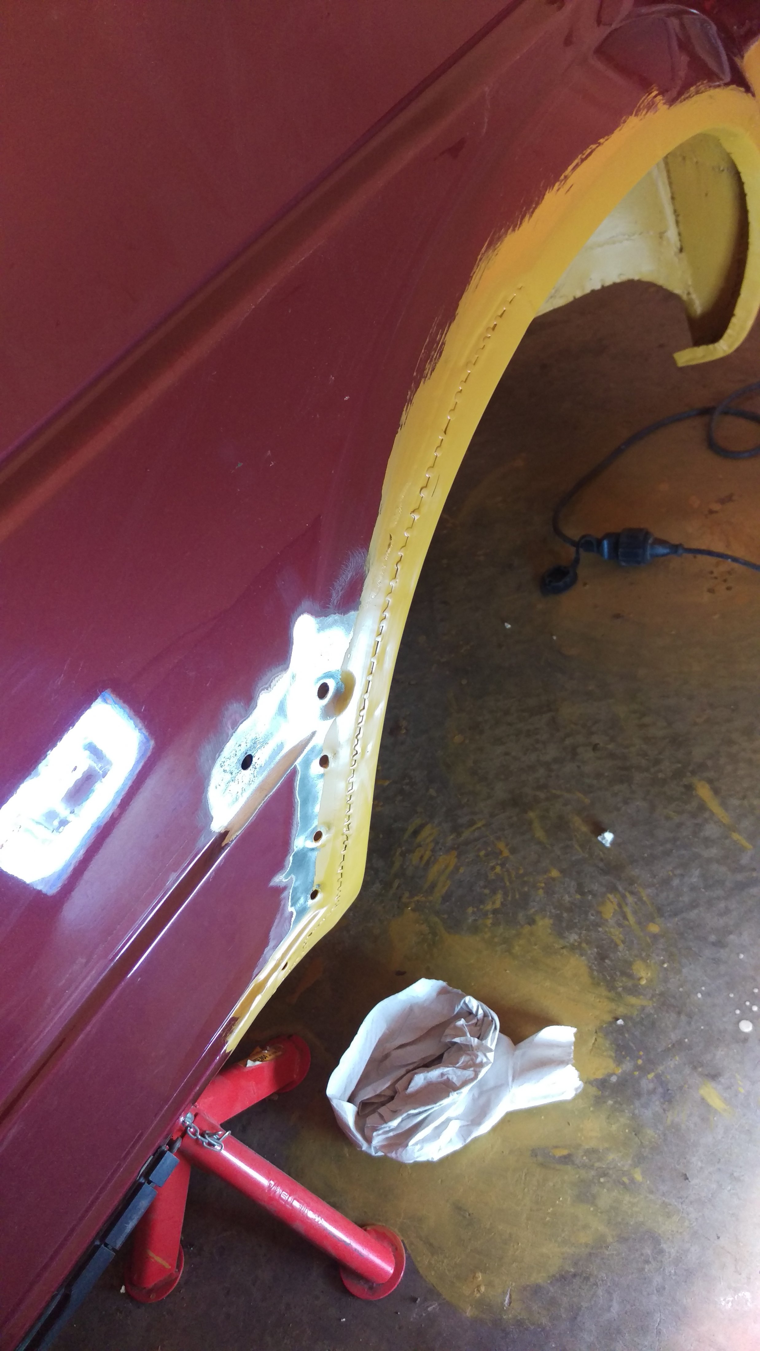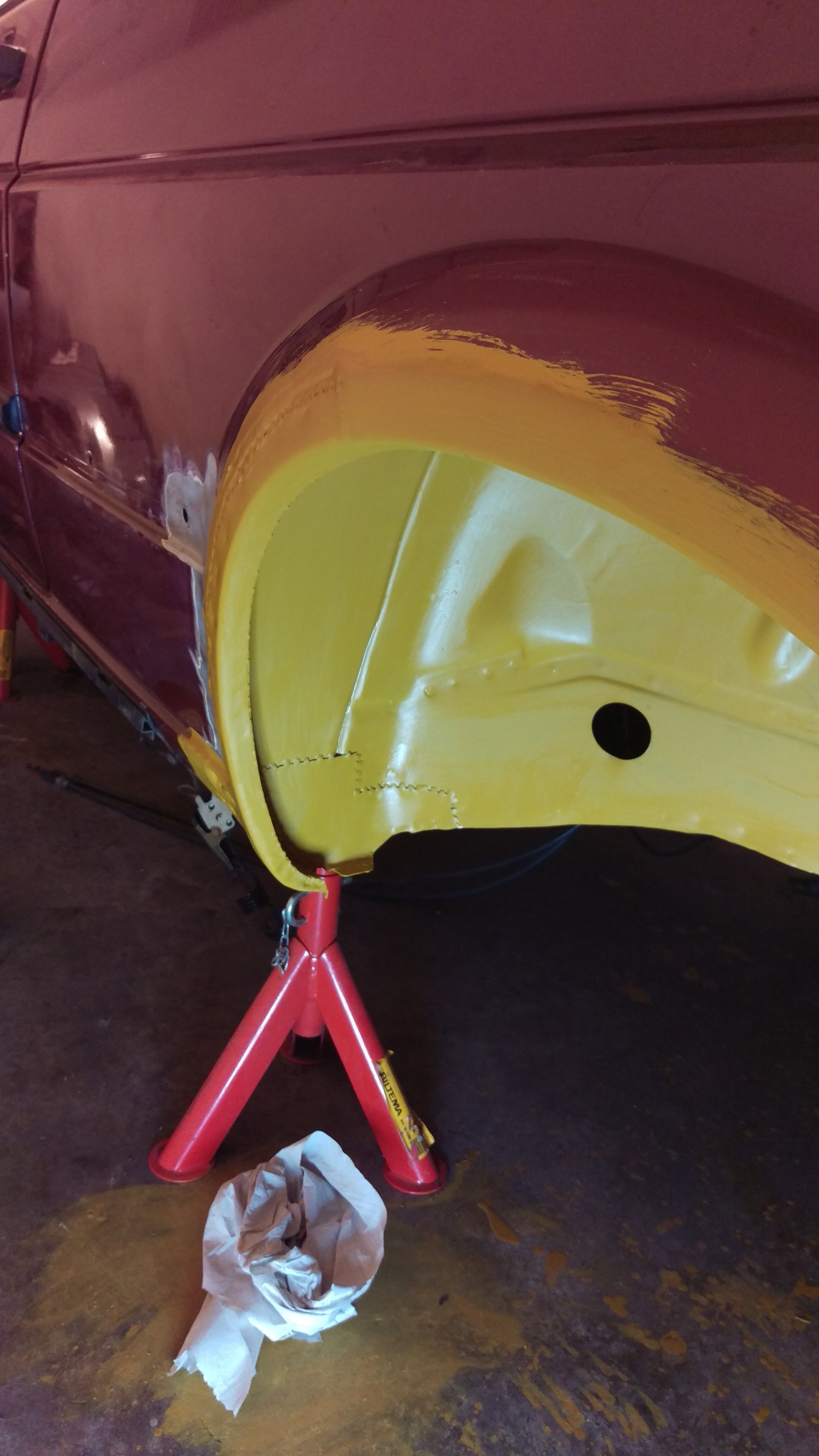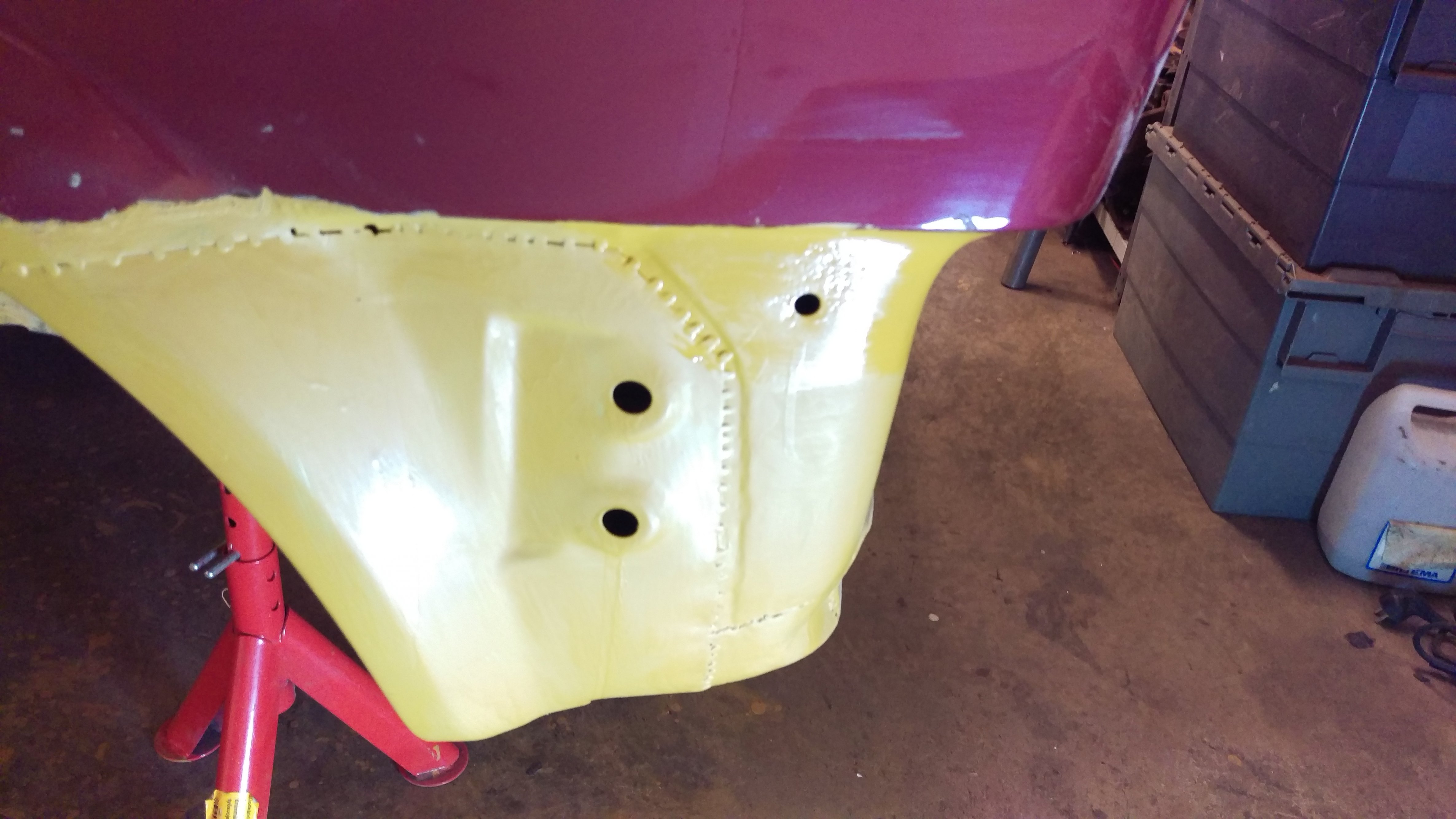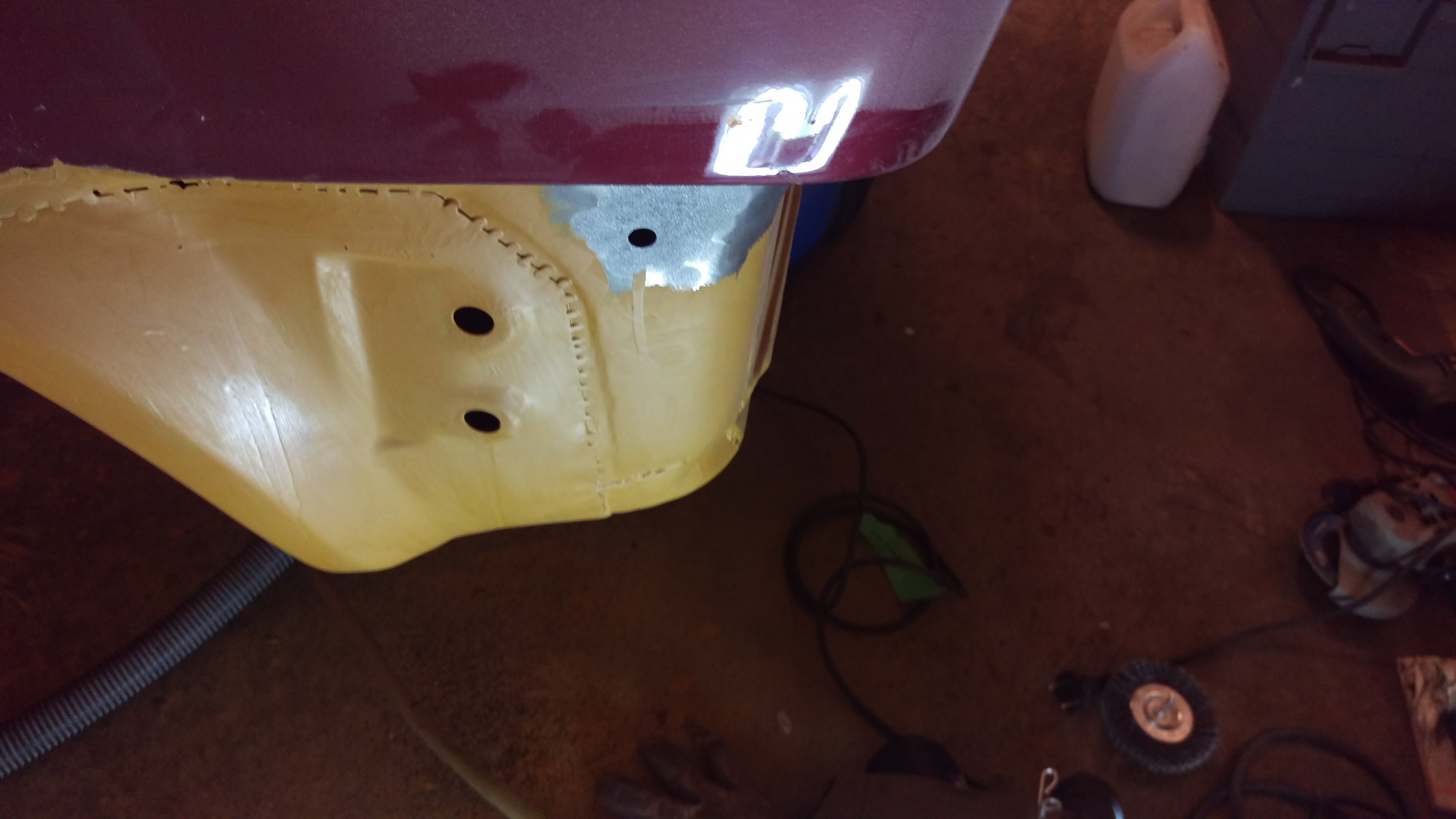 Blev en kväll i garaget igår med. Fortsatte med Skärmkanten bak på vänster sida med tillhörande hjulhus. Nu passar det och ser hyfsat ut. Svetsade klart yttre skärmkant, inre skärmkant och en bit av hjulhus/tröskel i framkant. Slipning och 3 lager 2K epoxiprimer senare blev det såhär: