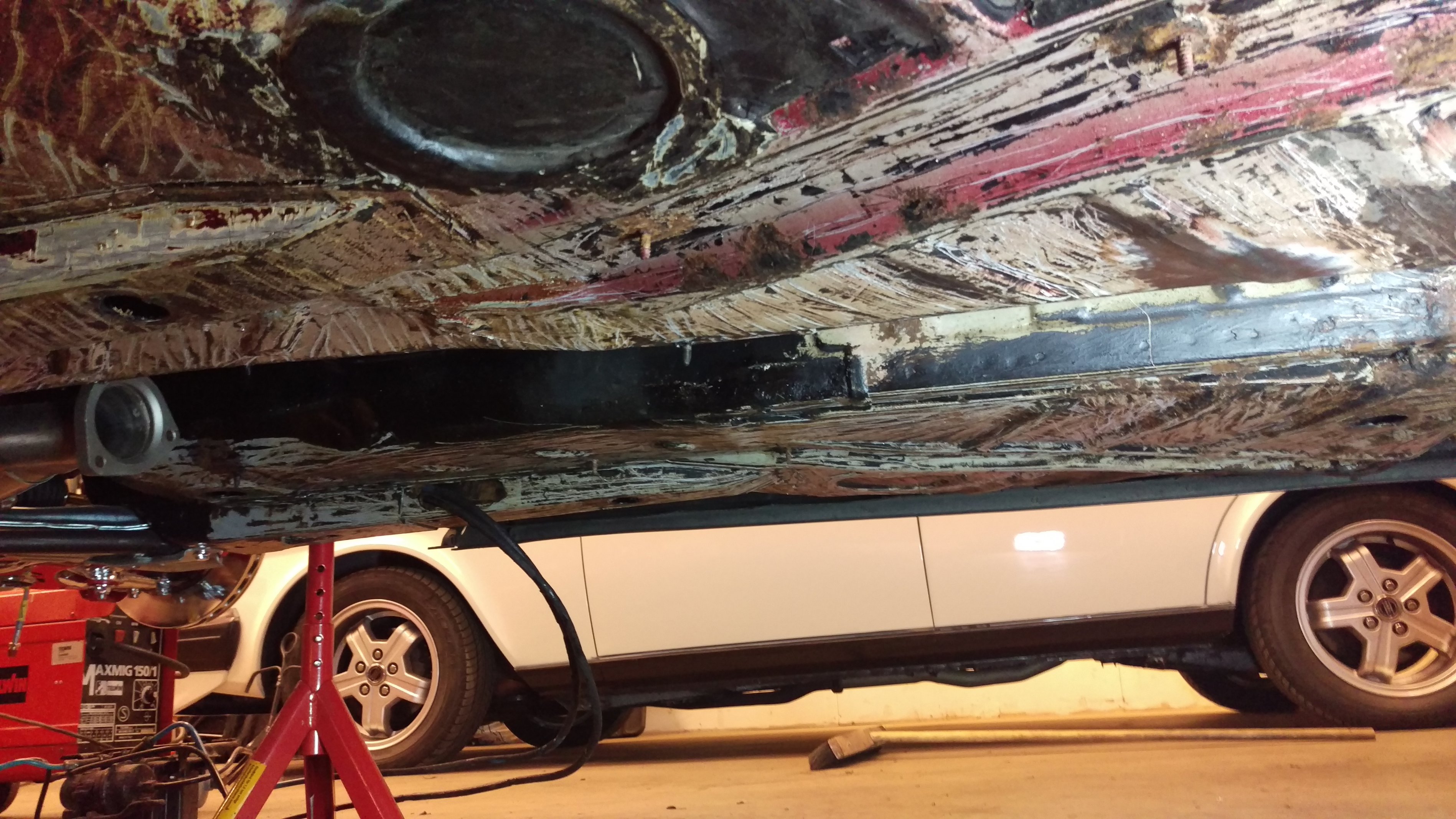 Kapade också bort balken framför bakaxelinfästningen (glömde ta kort) och konstaterade att jag behöver göra ett hål inne i bilen som jag sen sätter en gummiplugg i, annars kan jag inte komma åt att måla och rostskydda denna lagning från insidan. Samma sak för tröskeln, på den främre lagningen får jag ta upp ett par 30-40mm hål i innertröskeln så jag kan måla lagningen på insidan. Lite surt, men att laga rost utan att måla från båda sidorna är ganska kortsiktigt.