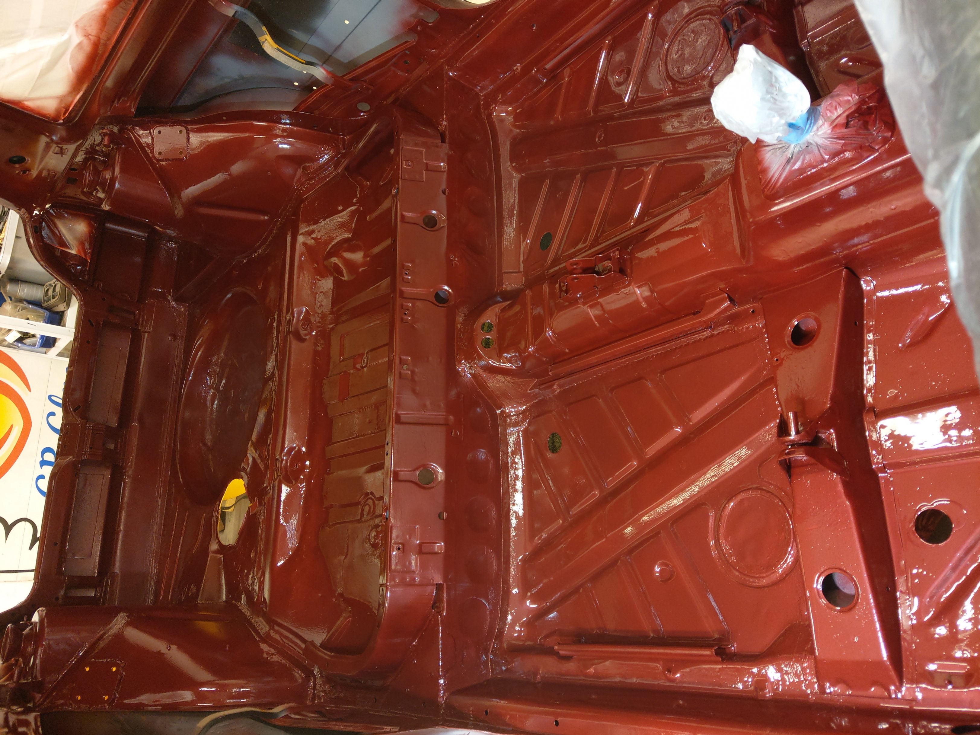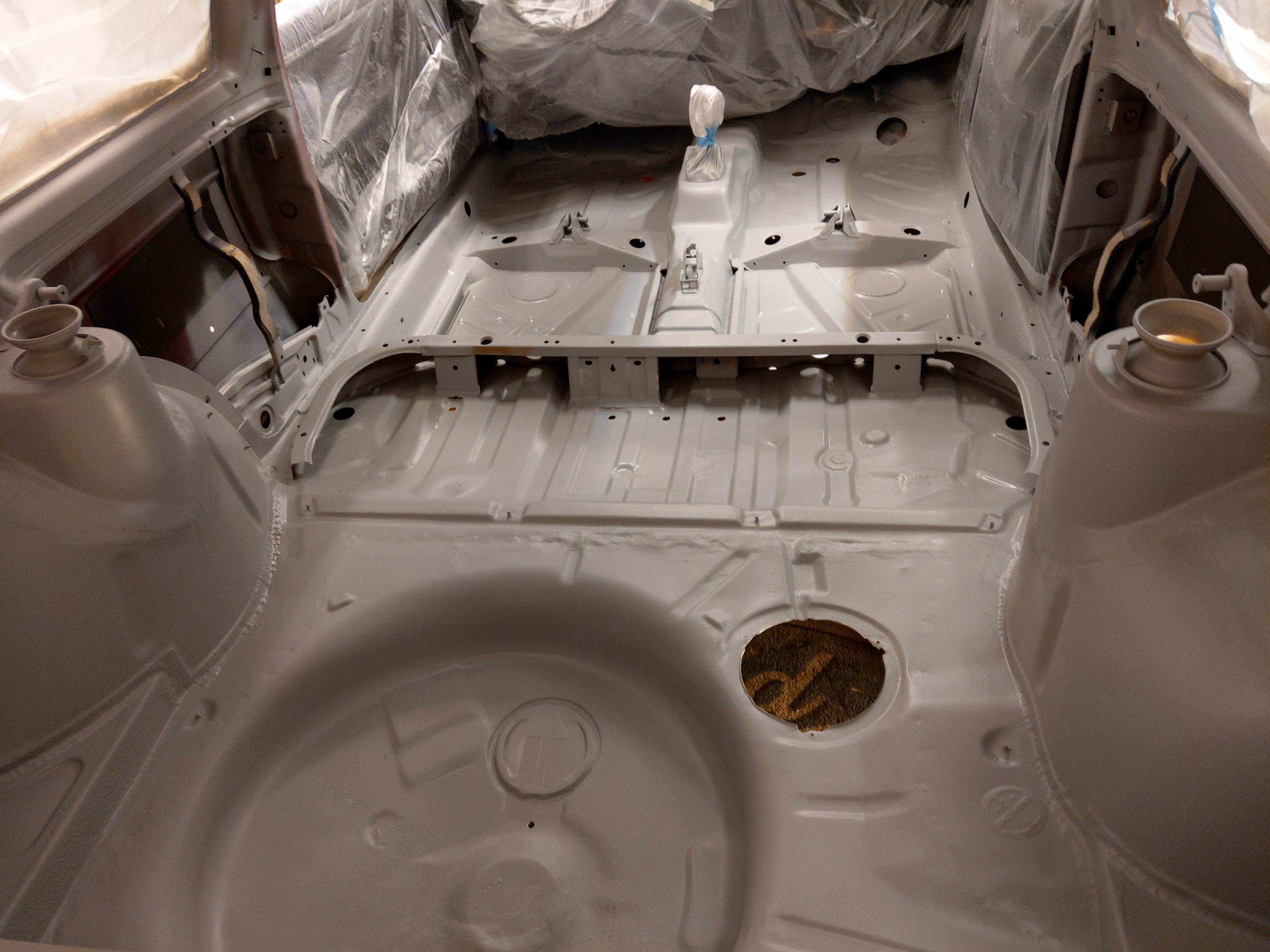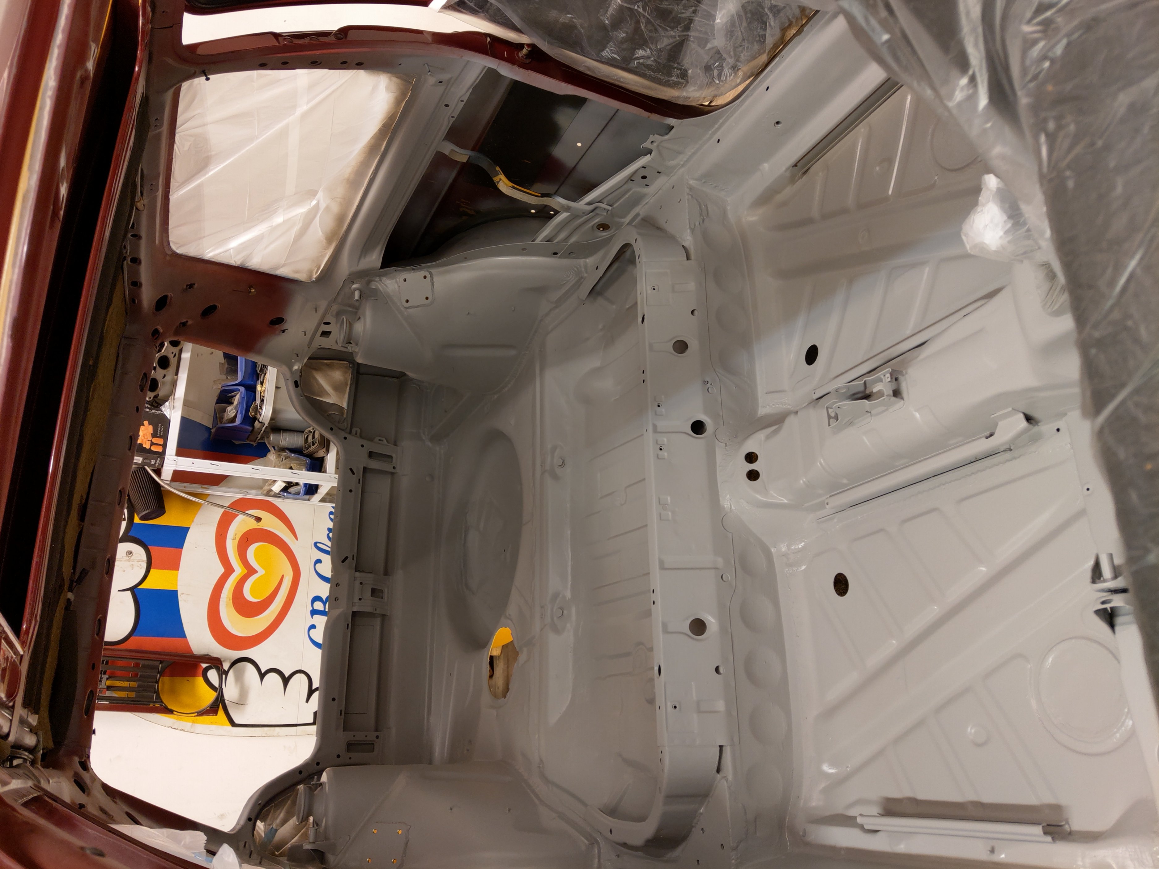 Ny färg kom med posten och nu har jag målat klat med 2K epoxy inne i bilen. Anledningen att jag penslar (om nån nu undrar) är för rostskyddets skull. Nu har jag arbetat in färgen med en pensel i alla hörn och glipor samt alla svetsfogar. Eftersom jag tätat allt underifrån kan jag ovanifrån fylla på alla svetsfogar och skarvar med färg tills de är fyllda. Då blir rostskyddet så bra som det kan bli utan att ED behandla bilen. De hade aldrig gått att få till om jag sprutat.