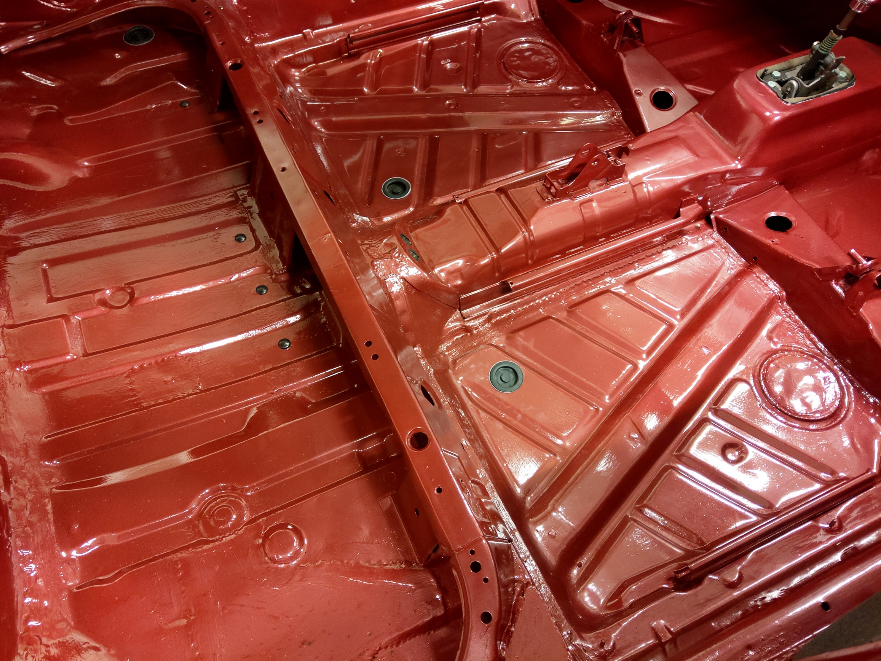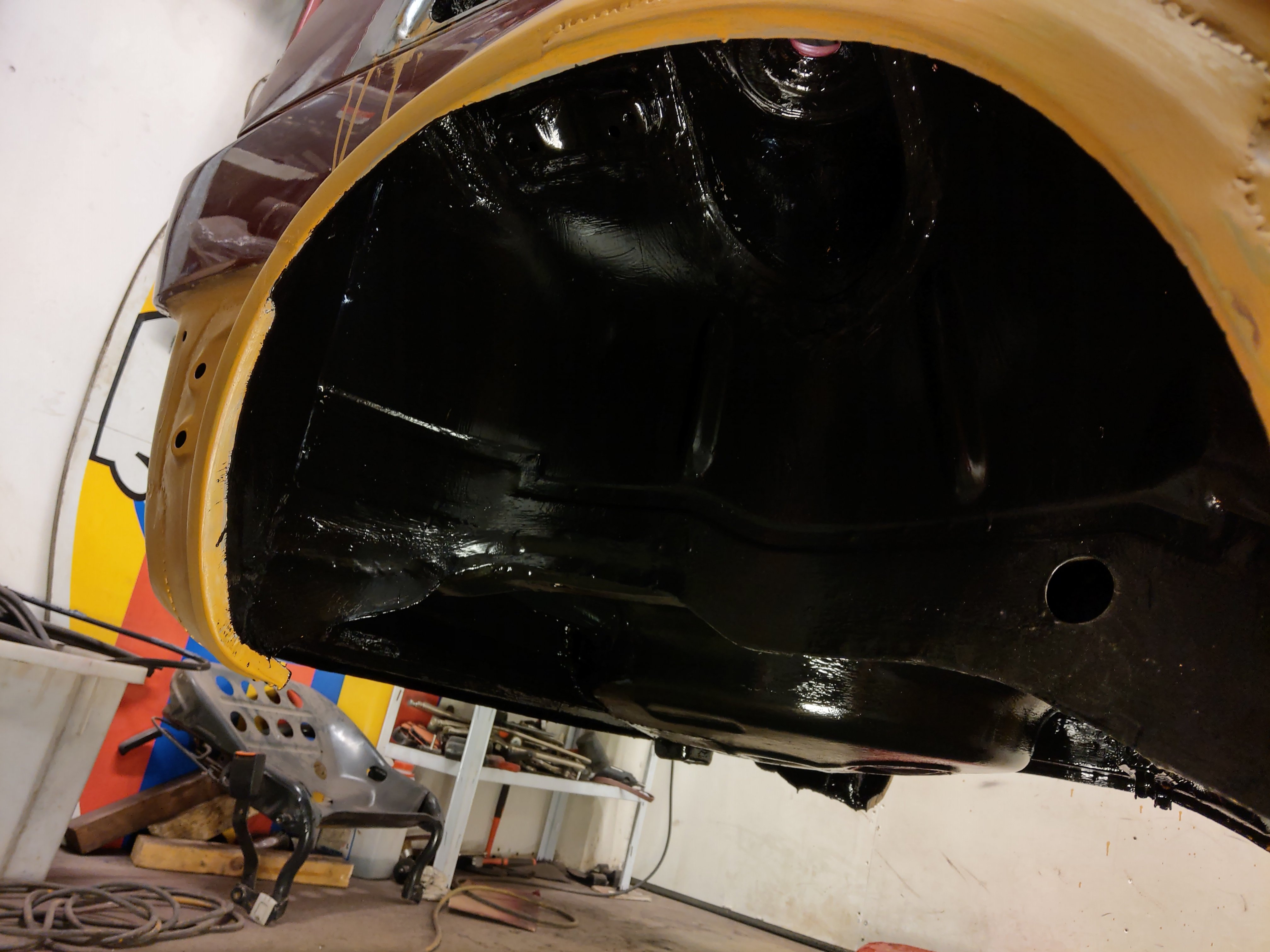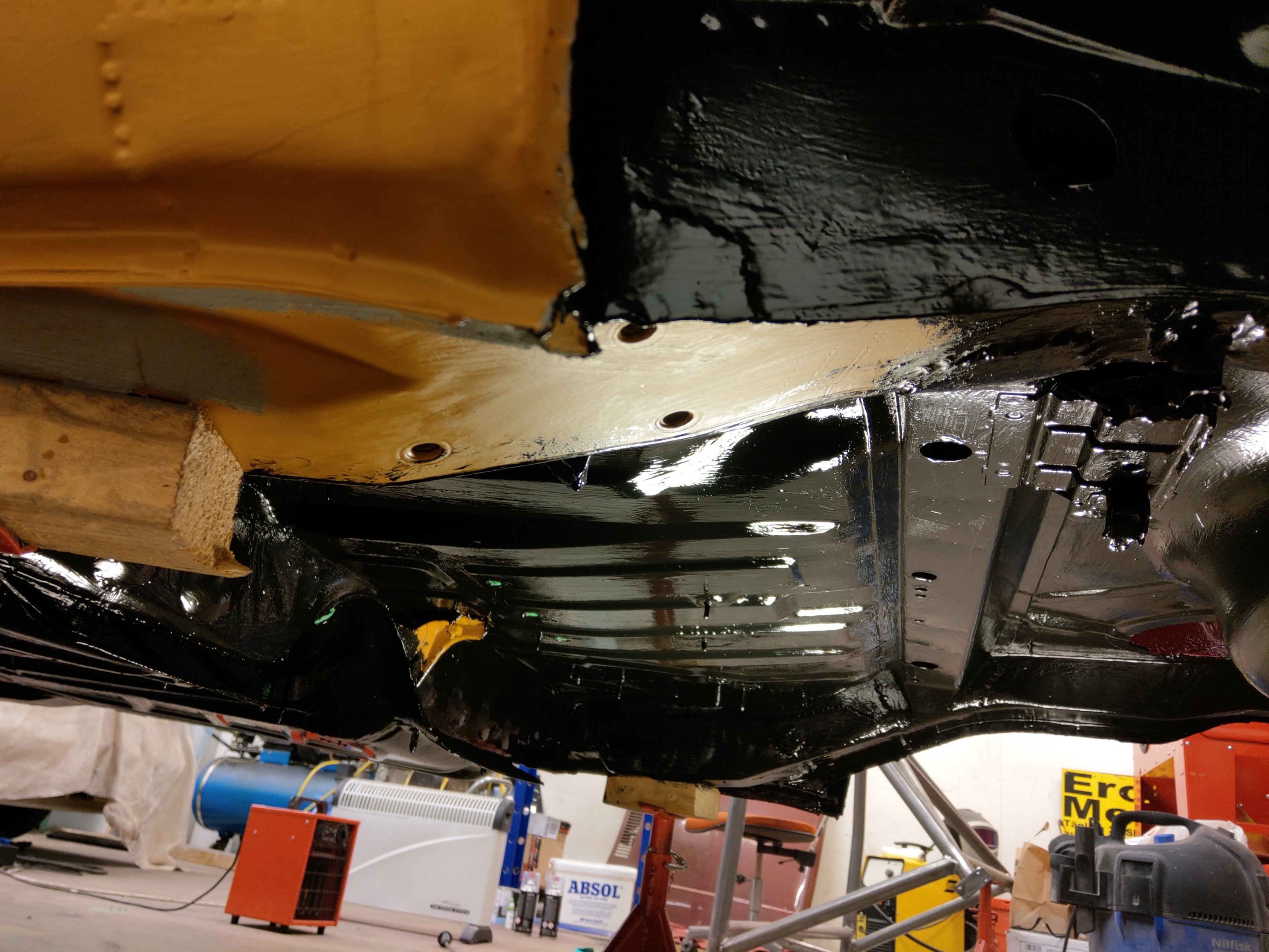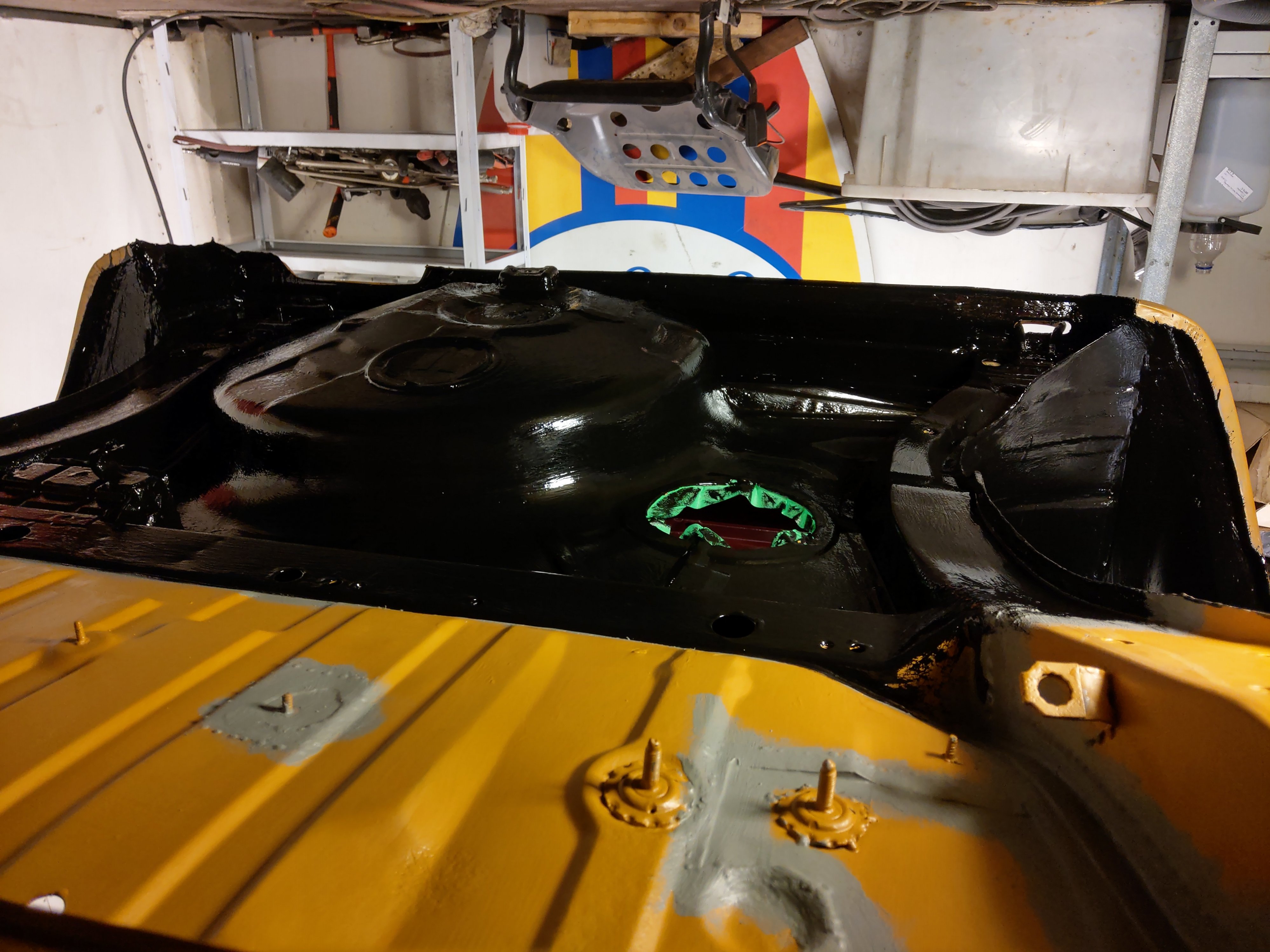 Båda bakre hjulhusen är nu också färdigmålade med 2 lager Temadur. Resten av golvet har nu också fått 1 lager (förutom några små fläckar vid pallbockarna och vid ett avgasfäste som jag glömt montera).