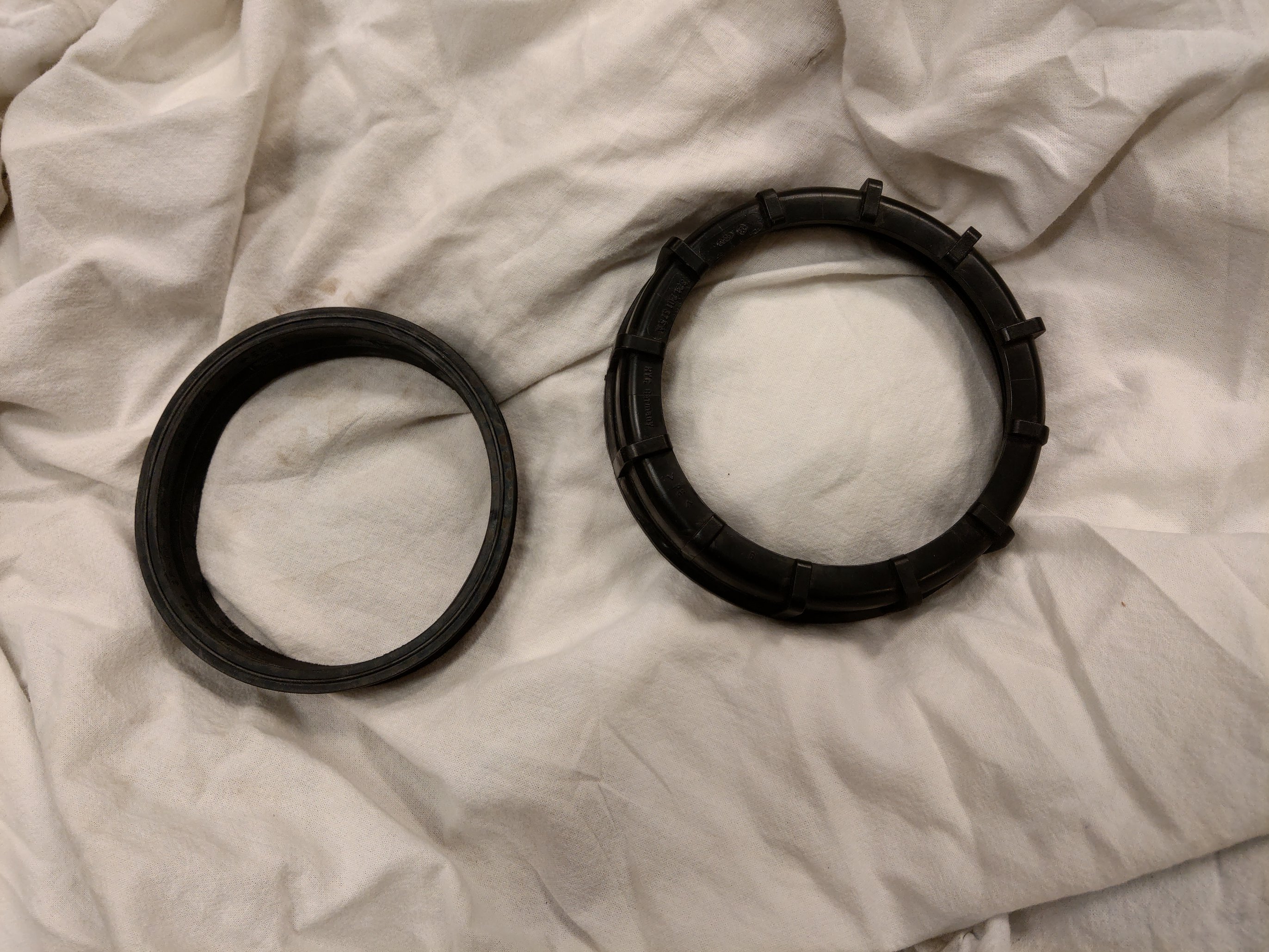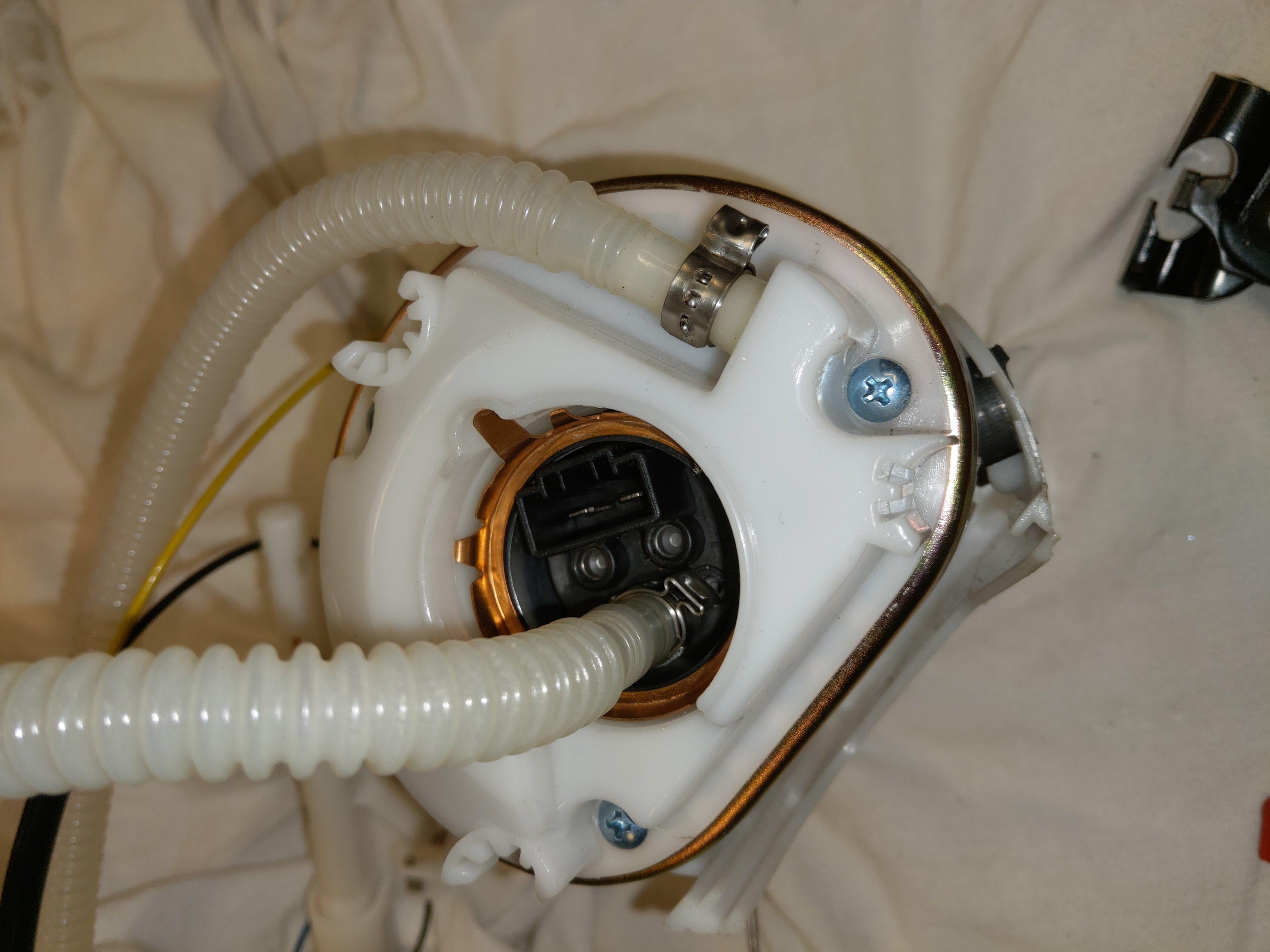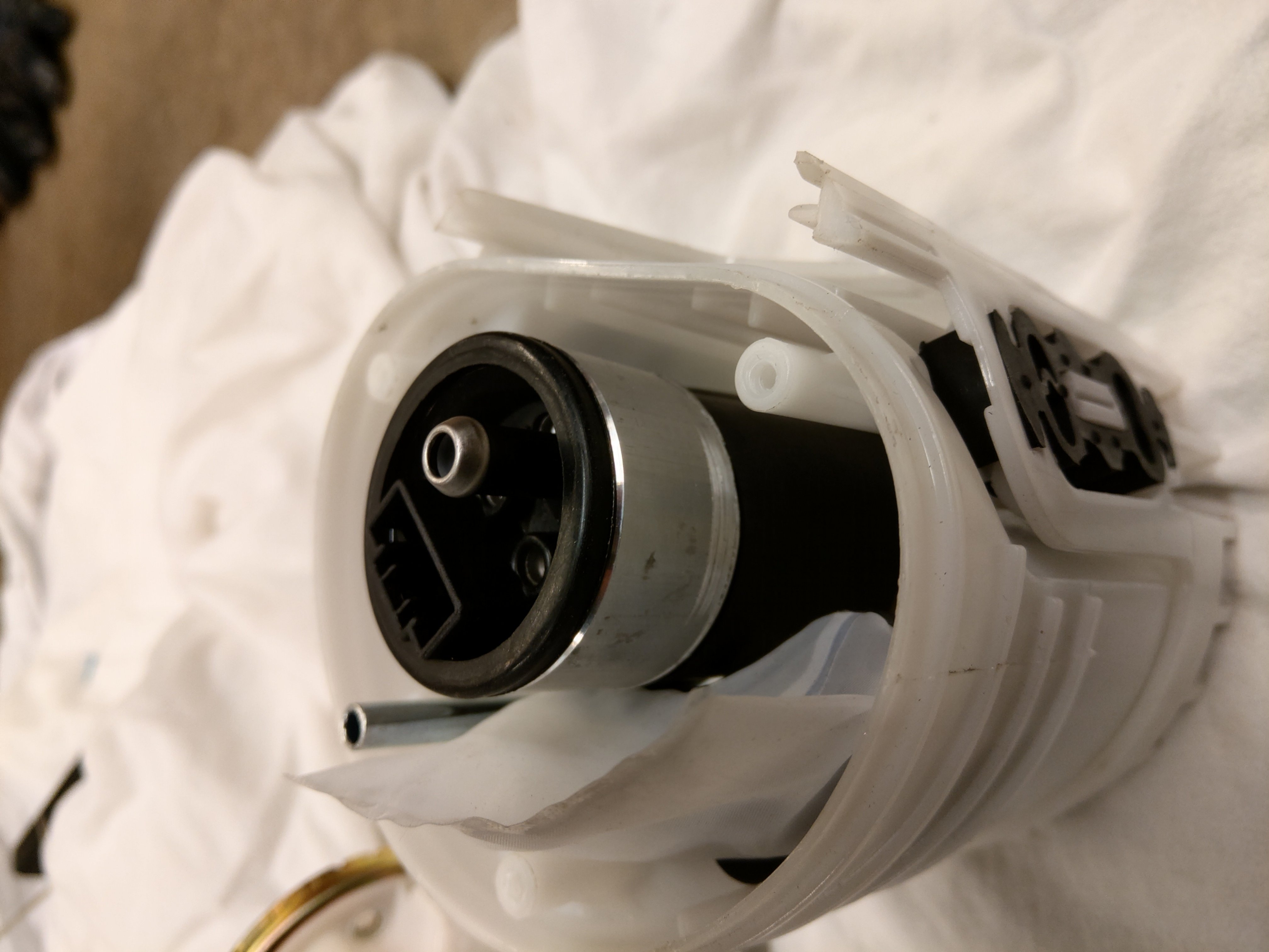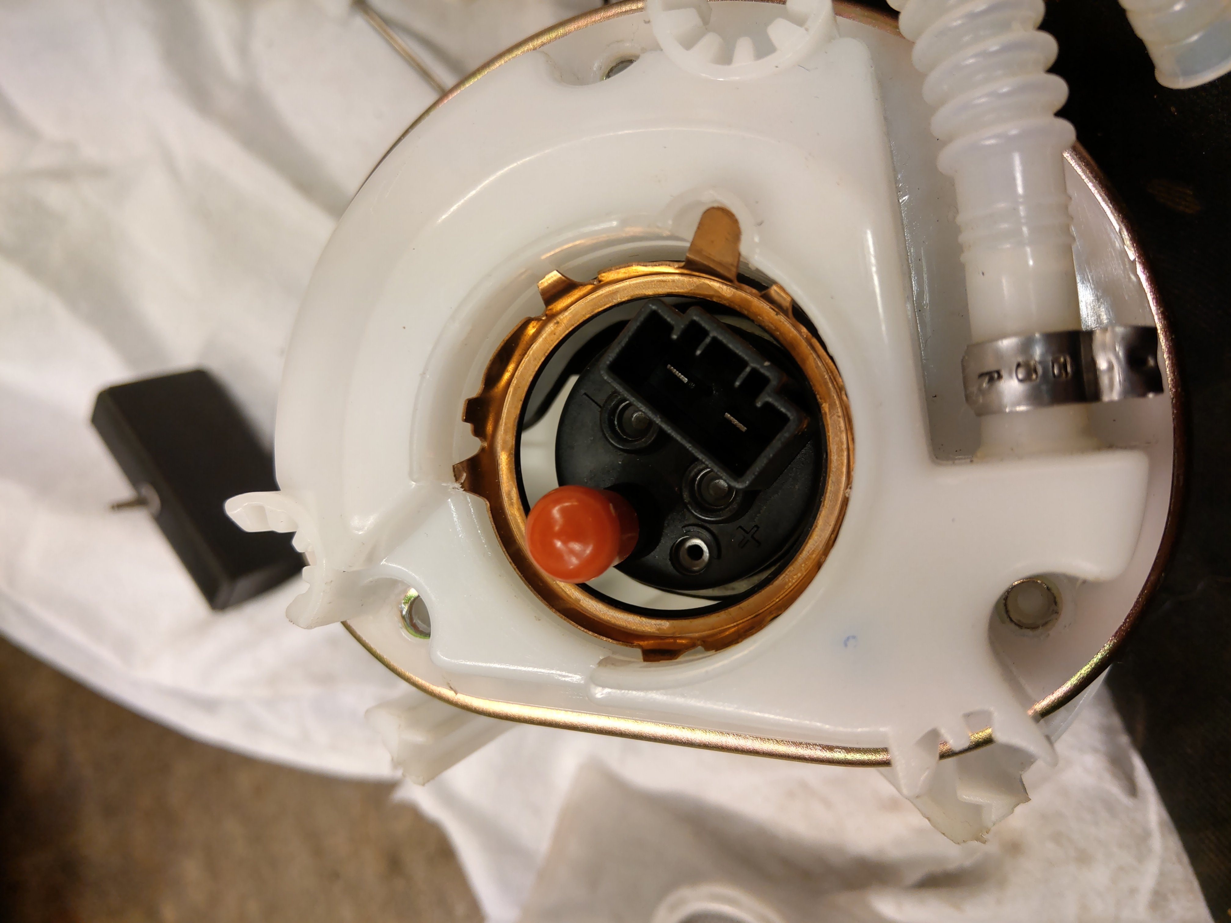 Nästa problem var att E85 pumpen var kortare. Bra på ett sätt, för då finns det mera plats till en mjuk böj på slangen mellan pump och locket till bensintanken. Dåligt eftersom pumpen hålls på plats genom att locket till catchtanken pressar fast pumpen genom att trycka på ovandelen av den. Den nya pumpen glappar 10-15mm upp och ned när det är ihopmonterat. Kommer naturligtvis inte att funka.