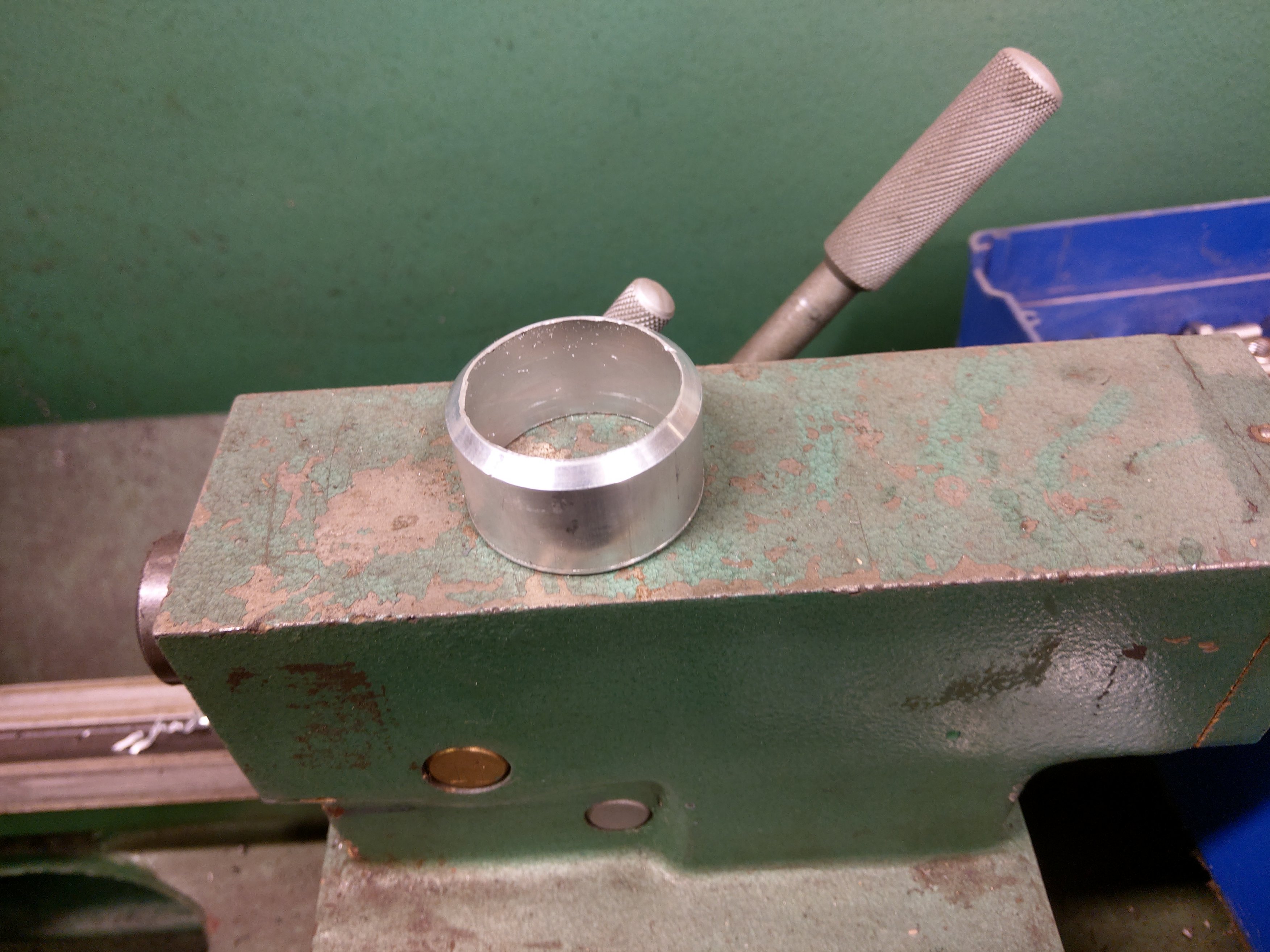 Div aluminiumrör hade kommit så igår blev det att dra igång svarven. Var länge sen jag använde den så trevligt att få lite omväxling. Efter lite testning så blev det ett 45mm rör som behöver ha fas åt båda hållen för att ligga bra an mot pump resp hus. Svarvning pågår: