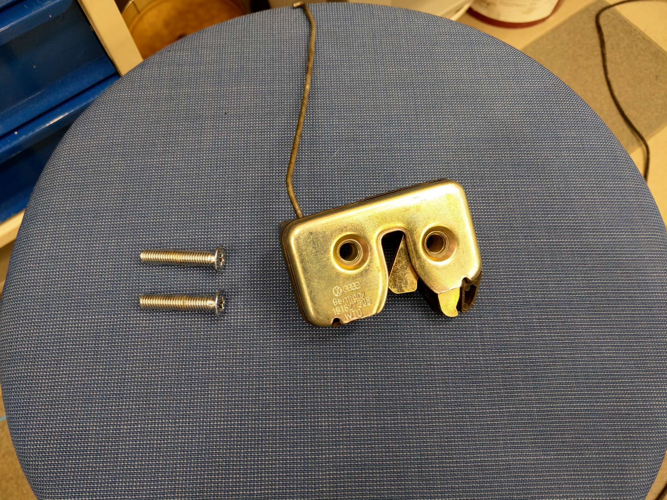 Efter lite stärkande mat och kaffe så tog jag mig an låset. Det som gått sönder är inte VW -org. Nån gång på tidigt 2000-tal eftermonterade jag elektriskt centrallås på bilen, och det var mekaniken till detta som gick sönder. Då detta var ett modellanpassat kit så bytte man ut hela hållaren etc på baksidan av låset till en som hade uttag för centrallås = inga reservdelar finns idag.