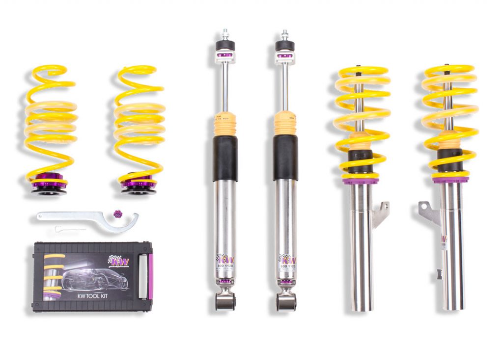 Also, the KW Variant 2 coilover suspension kit features adjustable dampers. Although in contrast to the KW Variant 3, only the low-speed rebound forces can be adjusted with 16 clicks in the Variant 2. The KW Variant 1 coilover suspension kit has no adjustable shocks, which means that the KW suspension manufacturer’s preset damper can no longer be adjusted.