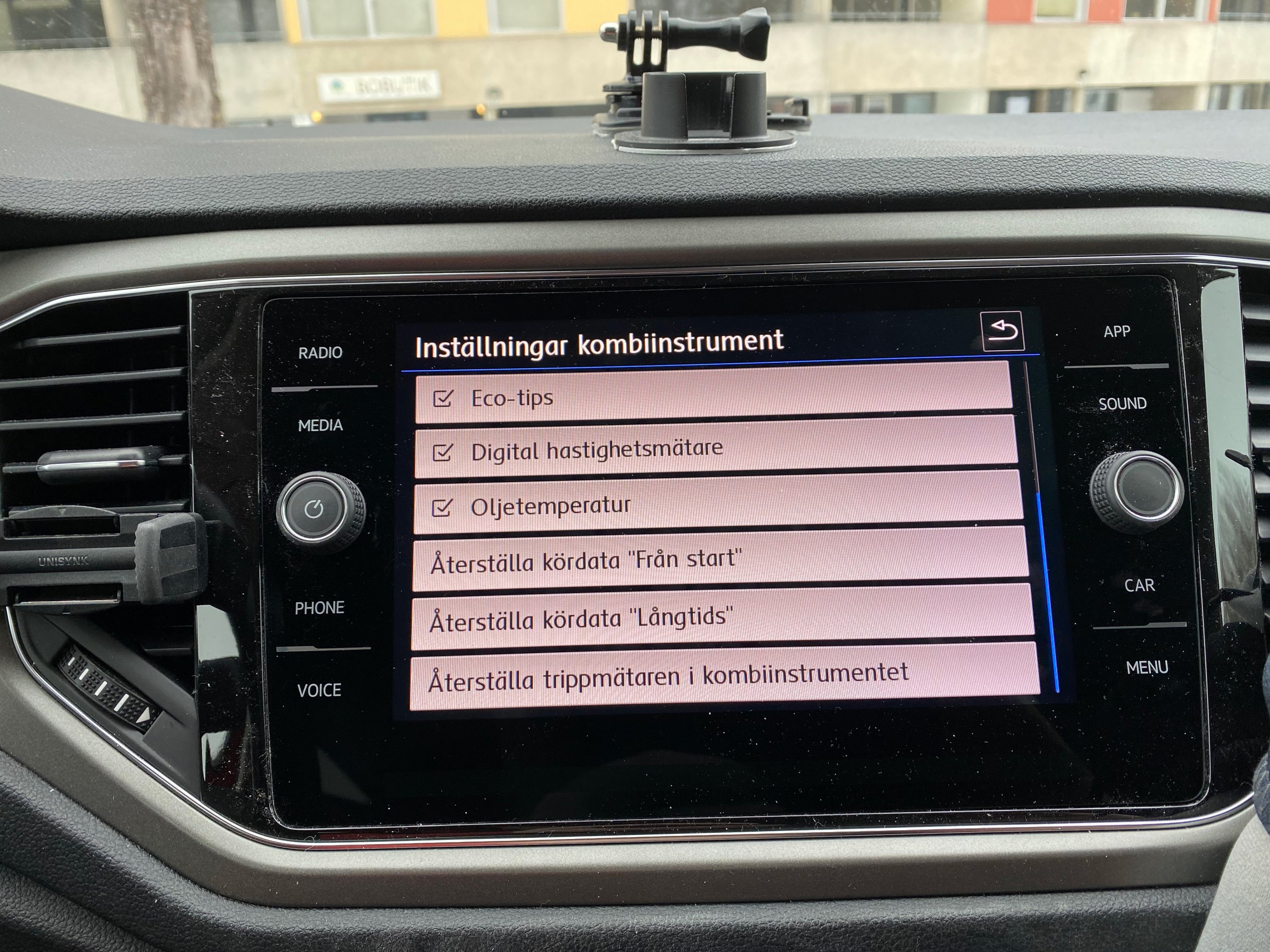 Det gick inte att nollställa med ok-knappen, då den har en lite annan funktion på T-Roc. Men det olika ”mätarna” finns. Verkar som man måste nollställa på samma korkade sätt i infotainmentsystemet.