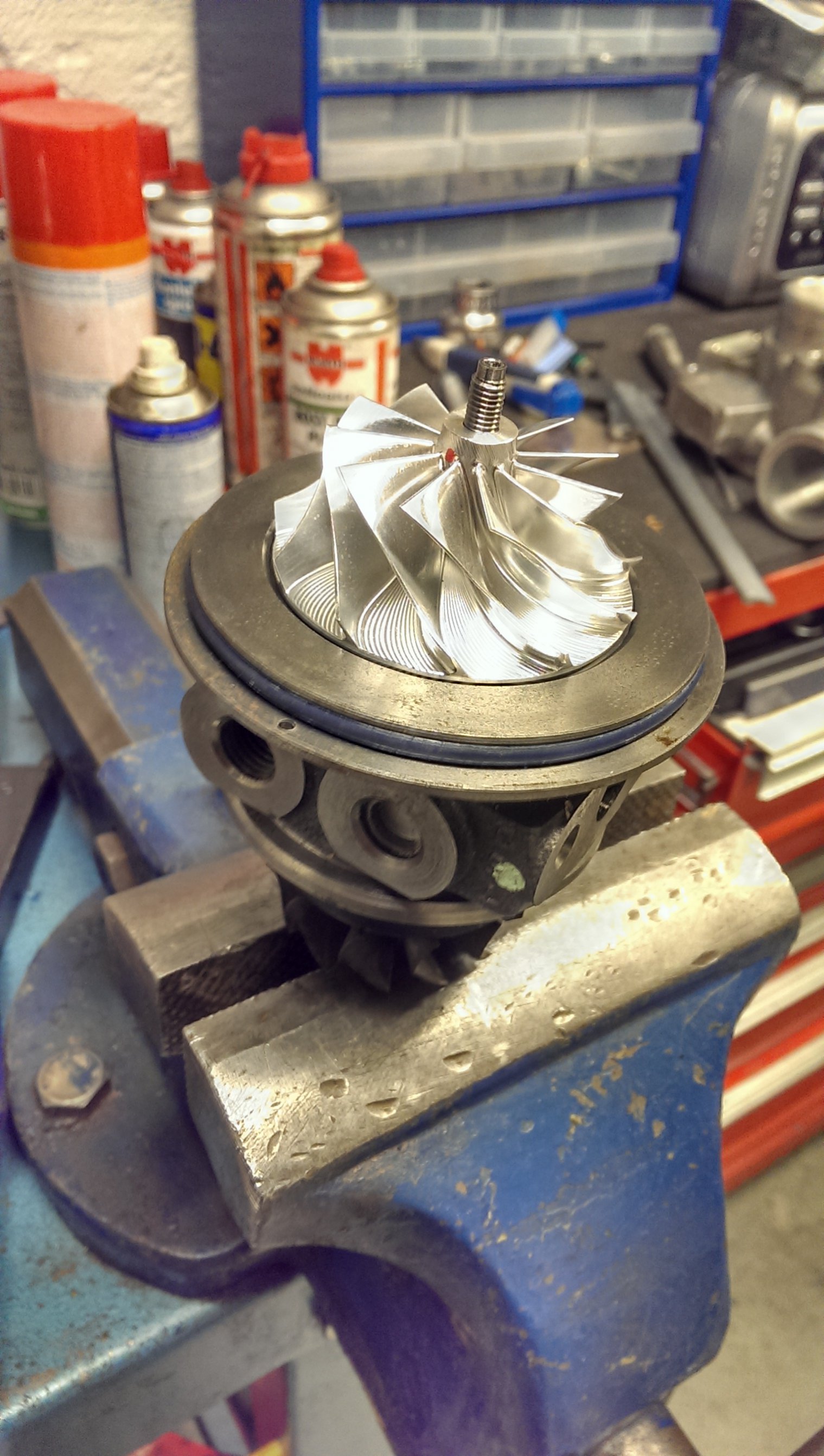 Nu är snigeln uppdaterad.. något mindre kompressorhus med ett nytt högflödande billet-hjul.. flödar tillräckligt för samma toppeffekt som tidigare, men spoolar 7-800rpm snabbare.. skall bli kul att se den med en rejäl ökning av vridmoment i botten/mellanregistren..! =)