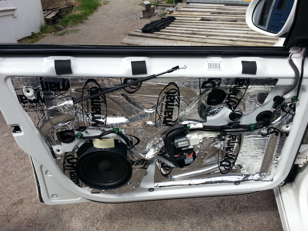 Och resultatet? som natt och dag. Inte ett skrammel i dörrarna när man drar på och riktigt bra midbas. Skall bara få tillverkad baslådan i bakluckan nu och få in min 10" JL bas så kommer det rocka.