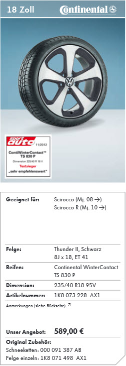 Fälg-däck-kombinationen är för den tyska marknaden. I Sverige erbjuds normalt sett andra kombinationer. Syftet med mitt inlägg var att visa en 18" fälg för Scirocco som VW rekommenderar för vinterbruk.