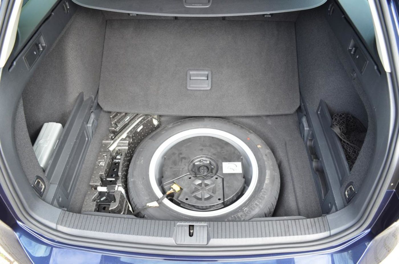 Så här ser det ut under bagagerumsgolvet på Passat Variant generation 8 med tillvalet Reservhjul fullstort på lättmetallfälg (motsvarande som standardfälgen på bilen).