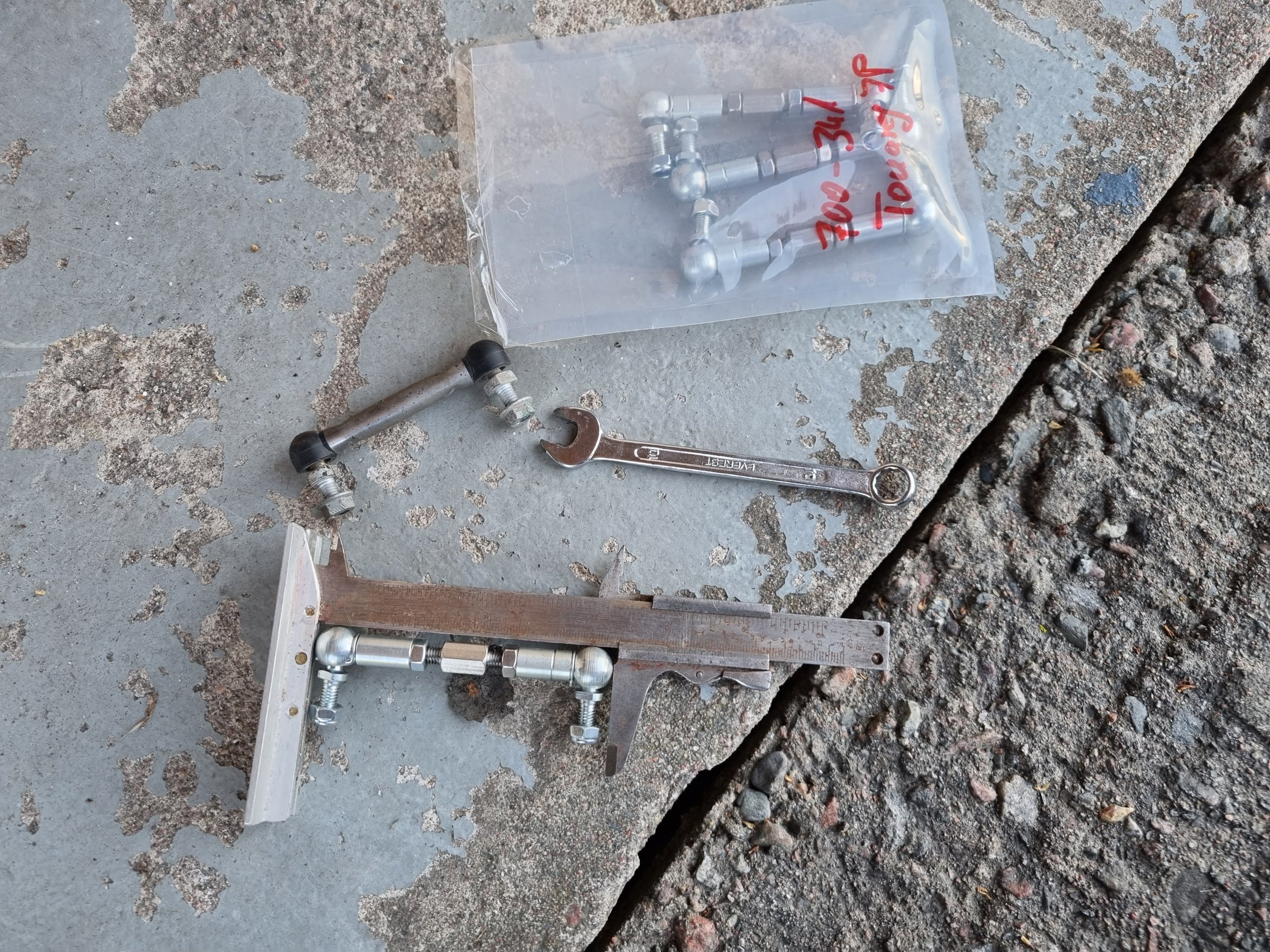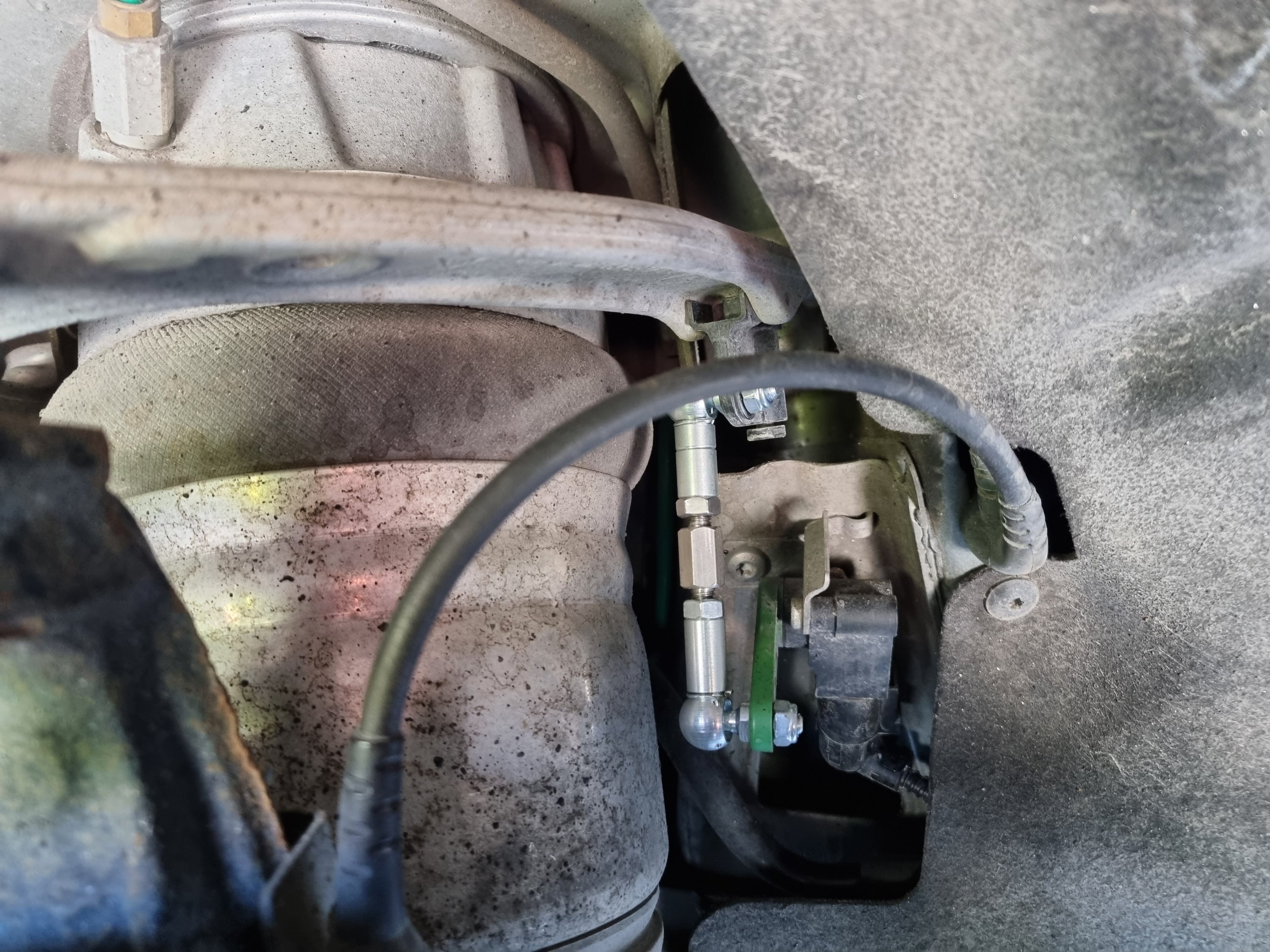 Bytt länkarmarna till nivågivarna. Ställde in dem 10 mm längre än original, det kanske motsvarar lika mycket på höjden, kontrollmätte inte innan. Risky att sänka för mycket, för vid 140 km/h sänks bilen automatiskt ytterligare. Hamnar man utanför spec kommer felmeddelande direkt.