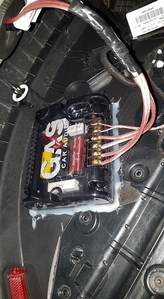 delningsfiltrena för högtalar kiten monterade på insidan av dörrsidan med dubbelhäftande tejp och smält limmmade med limpistol är likadant gjort på både fram och bakdörrarna