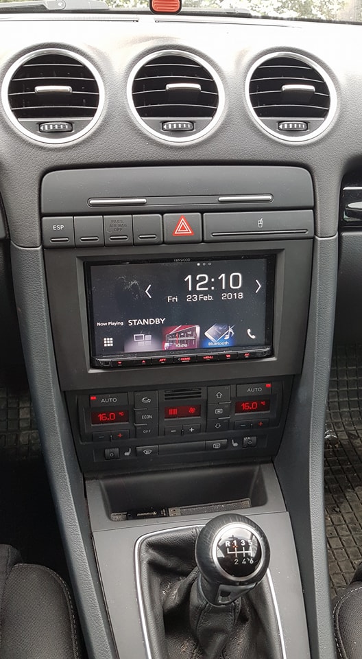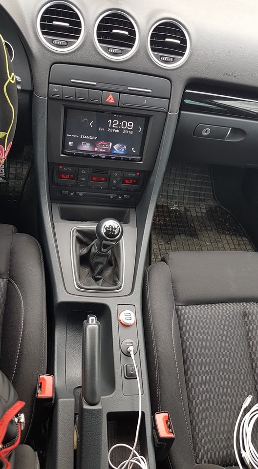 så brl var schyssta och lät mej byta till en stereo med annat märke utan nån extra kostnad så valet föll på en kenwood dmx7017bts och brl stod för inkoppling och drog även dit en kontakt för både aux och usb som nu sitter på mittkonsollen där original aux kontakten satt tidigare