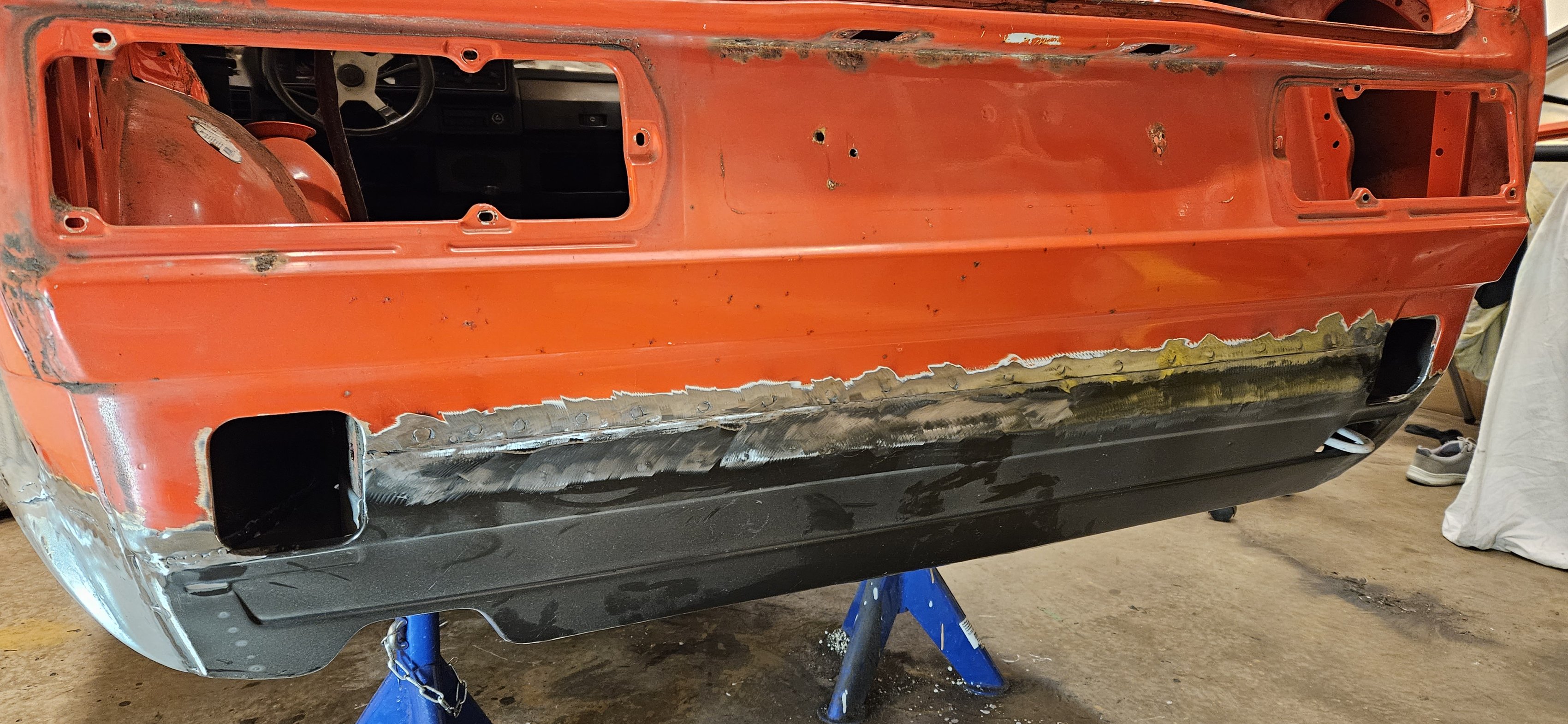 Detta är dock ingen reparation, utan bara att dölja problemet. Som synes på bilden så är den yttre tröskeln en rent estetiskt pryl (bakom b-stolpen) den har ingen bärande funktion utan "rambalken" är orange + lila som formar ett fyrkantsrör. Så det som är viktigt och bärande syns alltså inte överhuvudtaget.