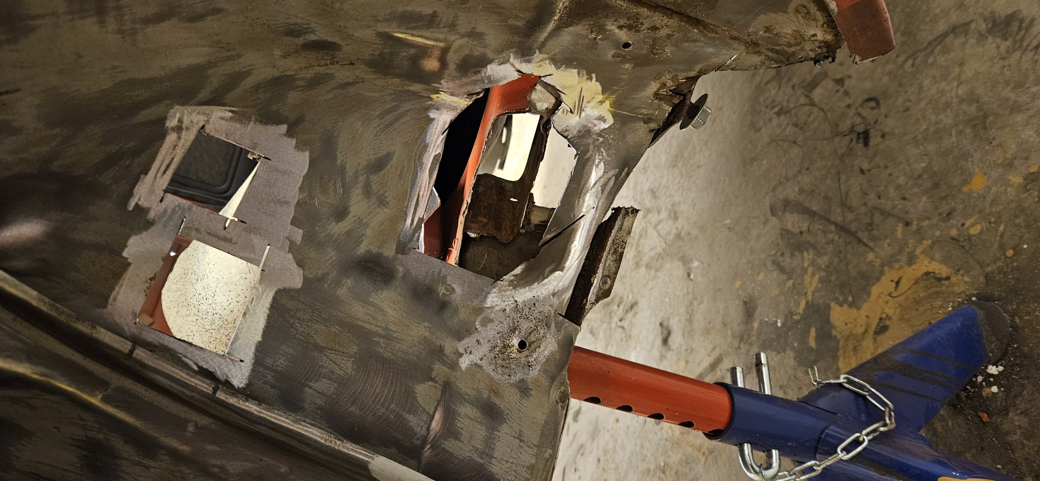 Inga överraskningar här eller, std-mk1-rost, och ganska lättlagat. Kommer dock göra utsidan först, så har jag god åtkomst att rostskydda baksidan på den lagningen innan jag svetsar på insidan.