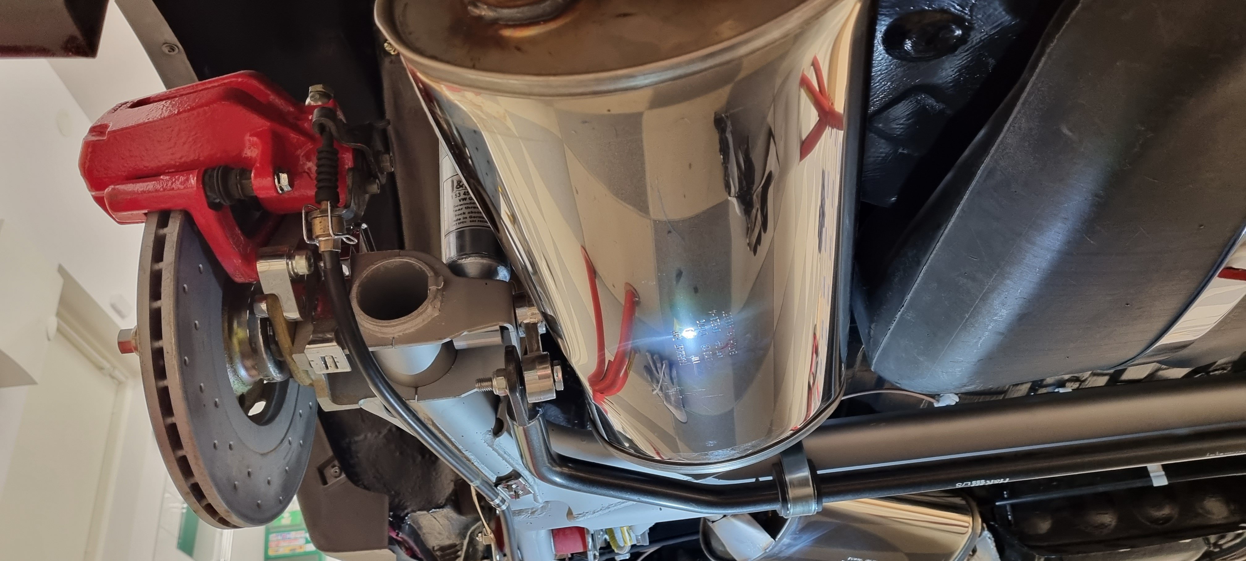 Sket sig direkt. När man har HR extra kräningshämmare bak så blir bakaxeln 3,5cm smalare per sida och ljuddämparen går emot, inte lite heller utan mycket. Efter att ha plockat den upp och ner ett 10-tal gånger och justerat allt som går att justera så är det bara att inse, det går inte. Skall det gå måste ljuddämparen vara smalare....:mad: