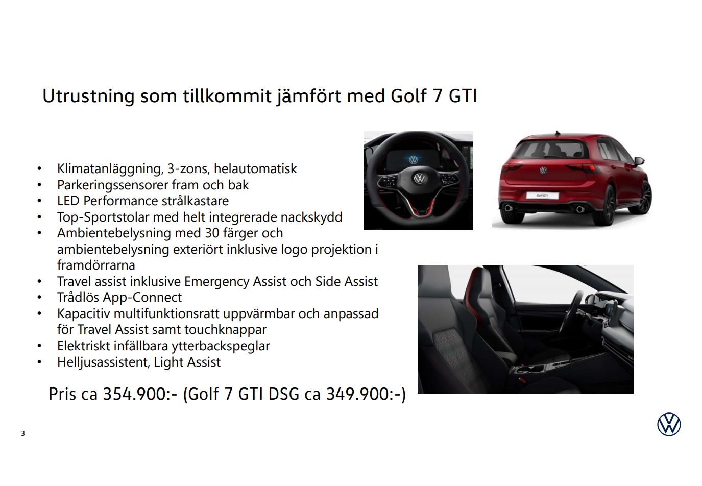 Nya Golf GTI med 245 hk och DSG-växellåda går nu att beställa på den svenska marknaden och kommer inom kort att kunna byggas på volkswagen.se. Rekommenderat cirkapris från 354 900 kronor. Nya Golf GTI Clubsport beräknas släppas för beställning i slutet av året och de första bilarna levereras preliminärt efter årsskiftet. Svenskt pris är ännu inte fastställt.