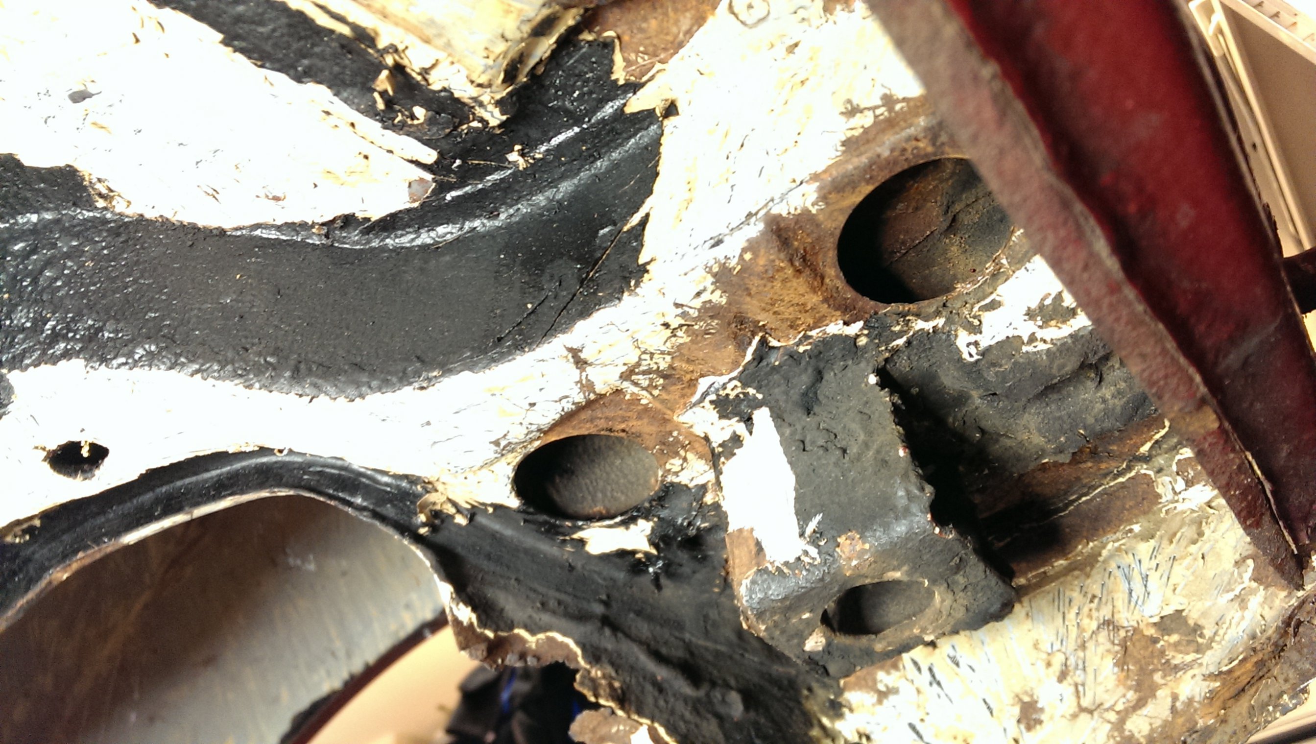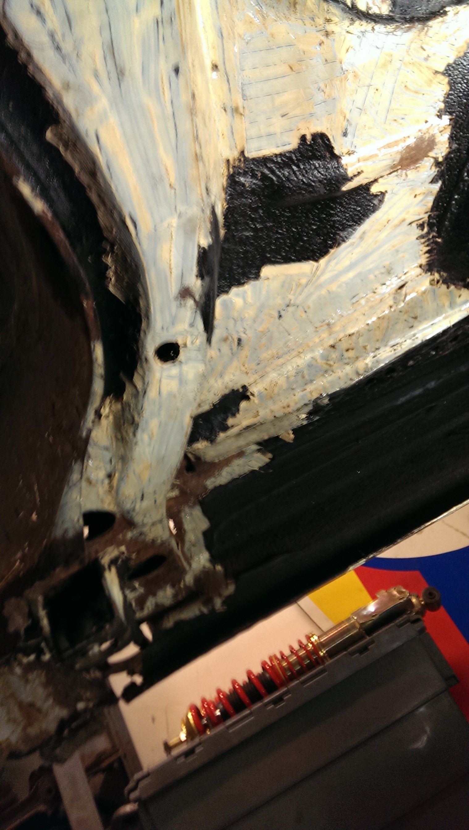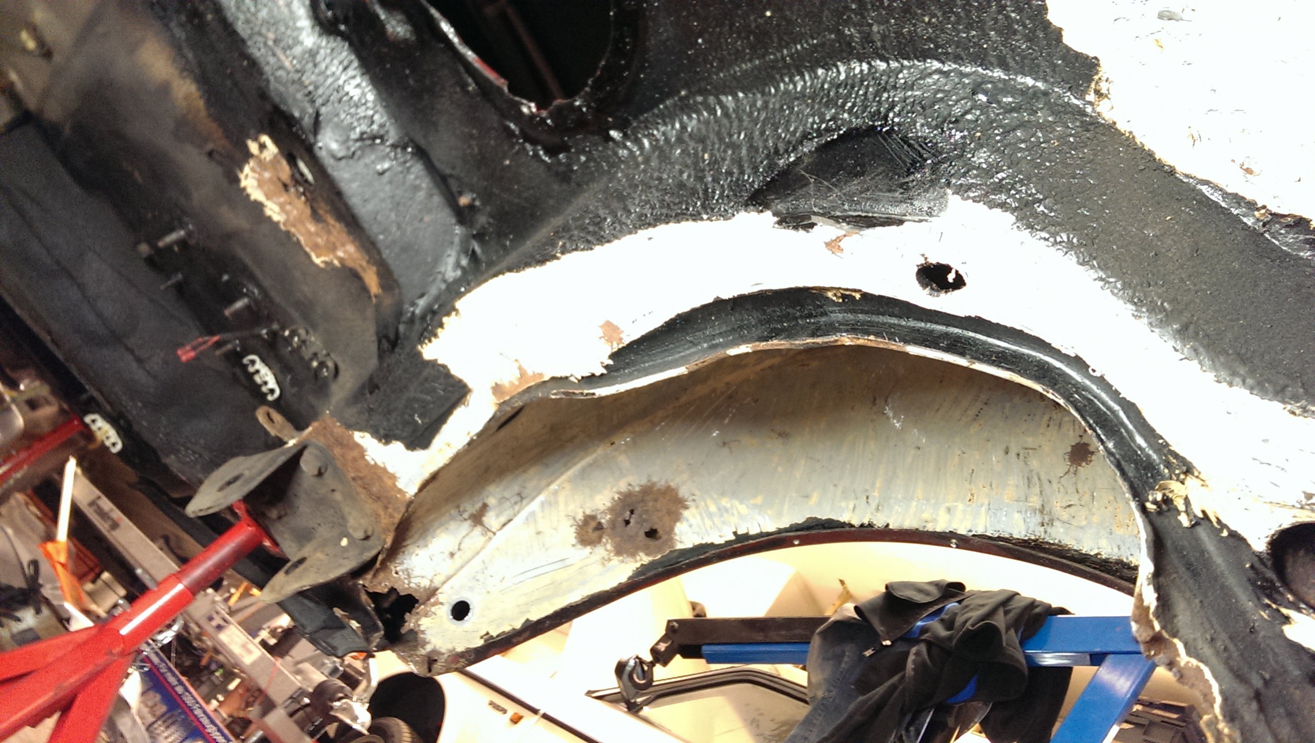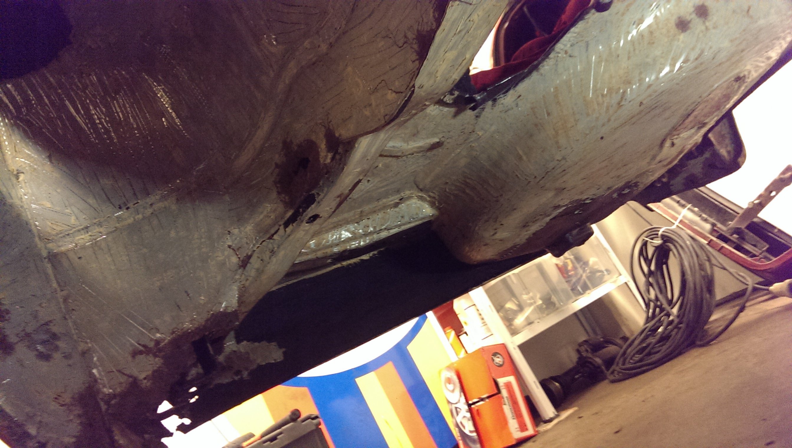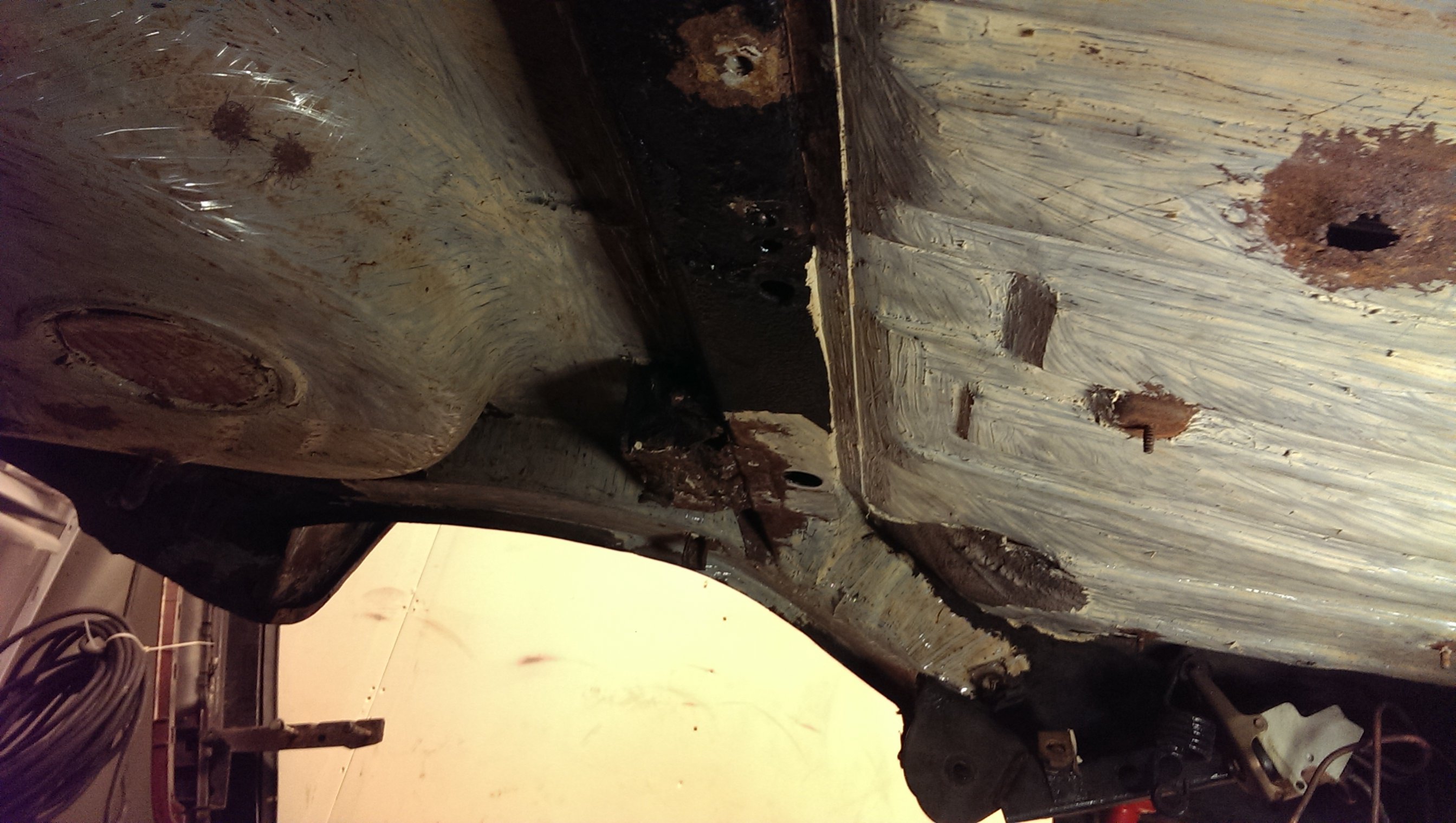 Eftersom det har dolt sig så mycket rost under originalrostskyddet så har jag beslutat mig för att skrapa av allt på hela bakre delen av bilen, inte bara hjulhusen. Hjulhusen är klara nu så jag fortsatte igår med att skrapa under bilen. Inte lika illa som i hjulhusen men jag kommer definitivt att byta bakre delen av sidobalken också. Blir att beställa mera plåt!