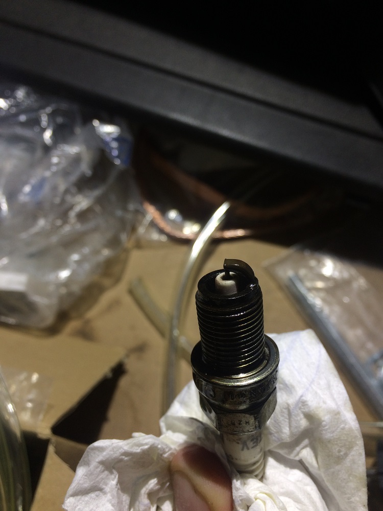 Värre var det med tändstiften. Hade köpt tändstiftsnyckel med T-handtag från Biltema. Ja jag får skylla mig själv.. Första tändstiftet som skulle bort, kras! Handtaget på nyckeln gick i två bitar. Åkte och köpte en 16mm tändstiftshylsa istället, gick som en dans =)