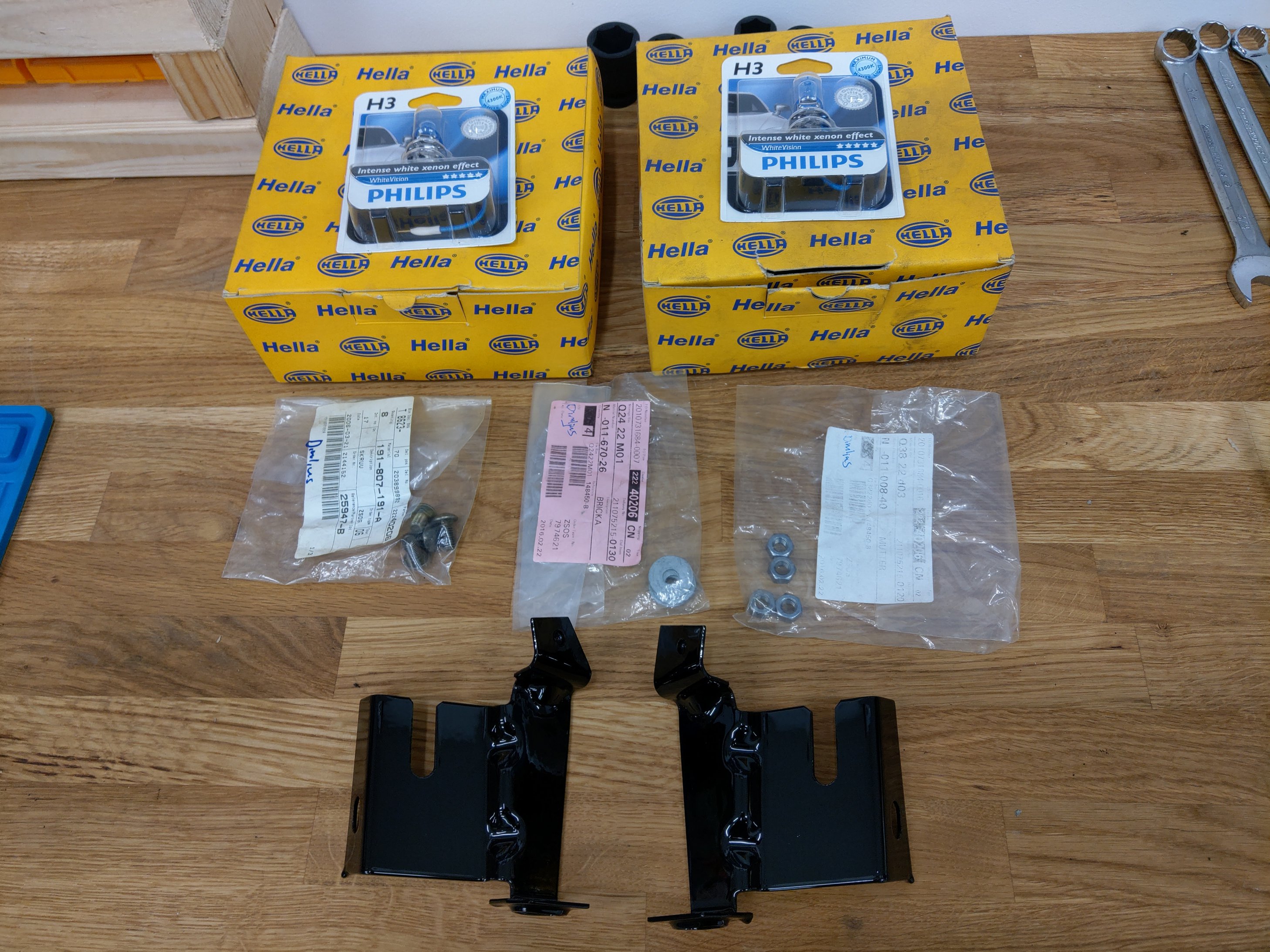 I de gula Hella lådorna ligger unika dimljus, inköpa för 19 år sen och lagda på hyllan. Hellas org styling-dimljus (projektor) med glas i glas och svart optik. Mycket snygga tycker jag. Kom till användning nu iaf: