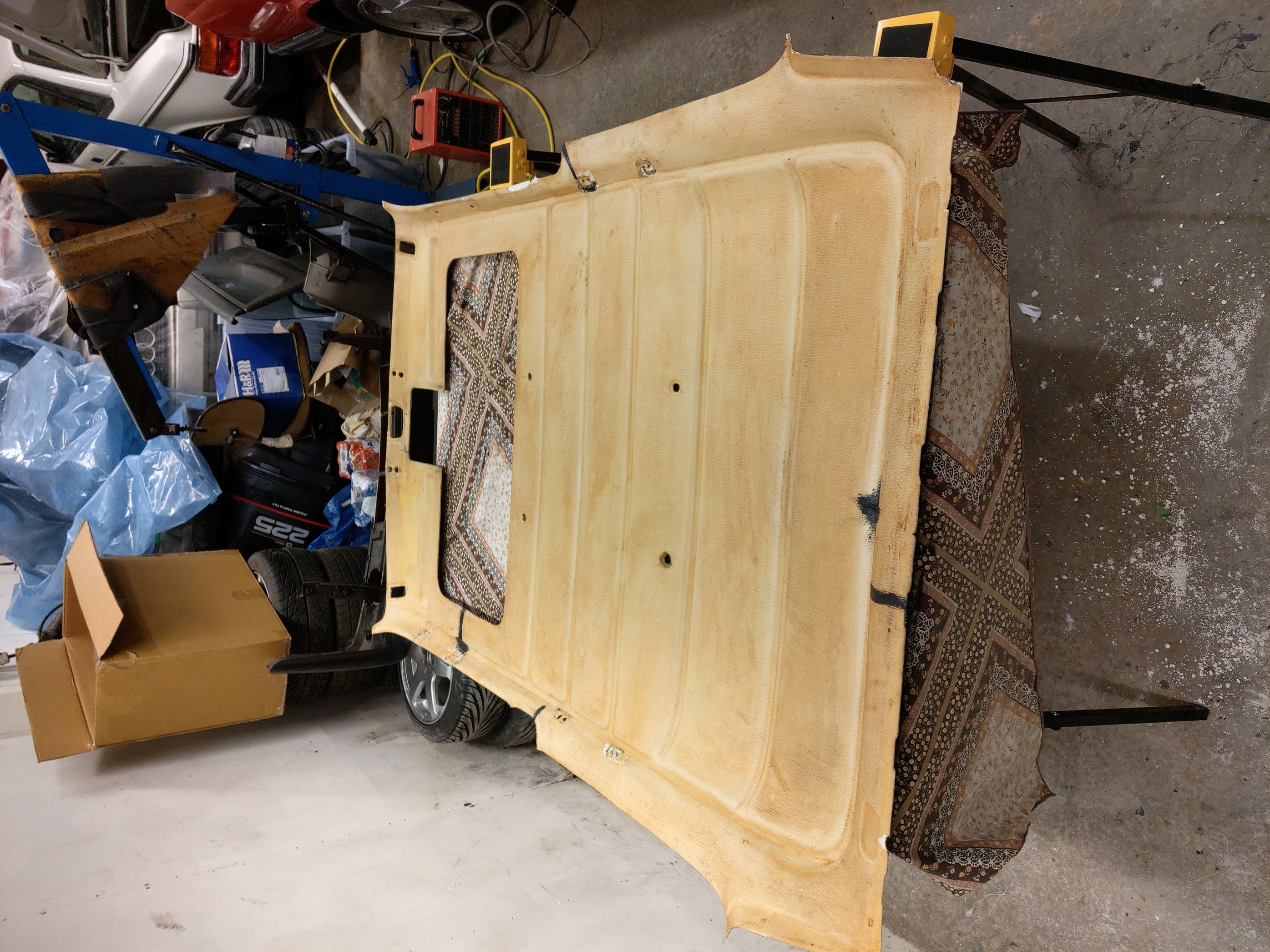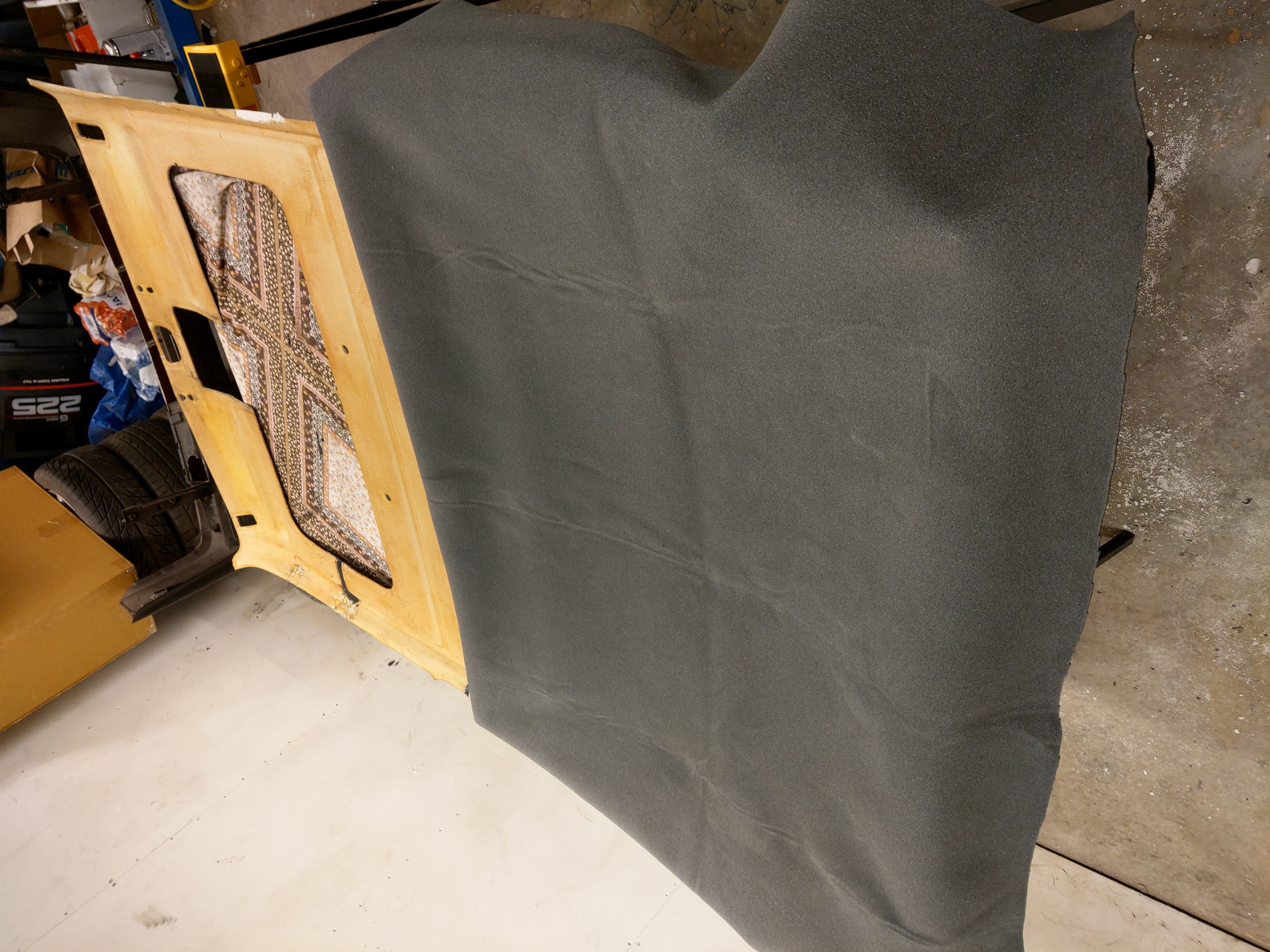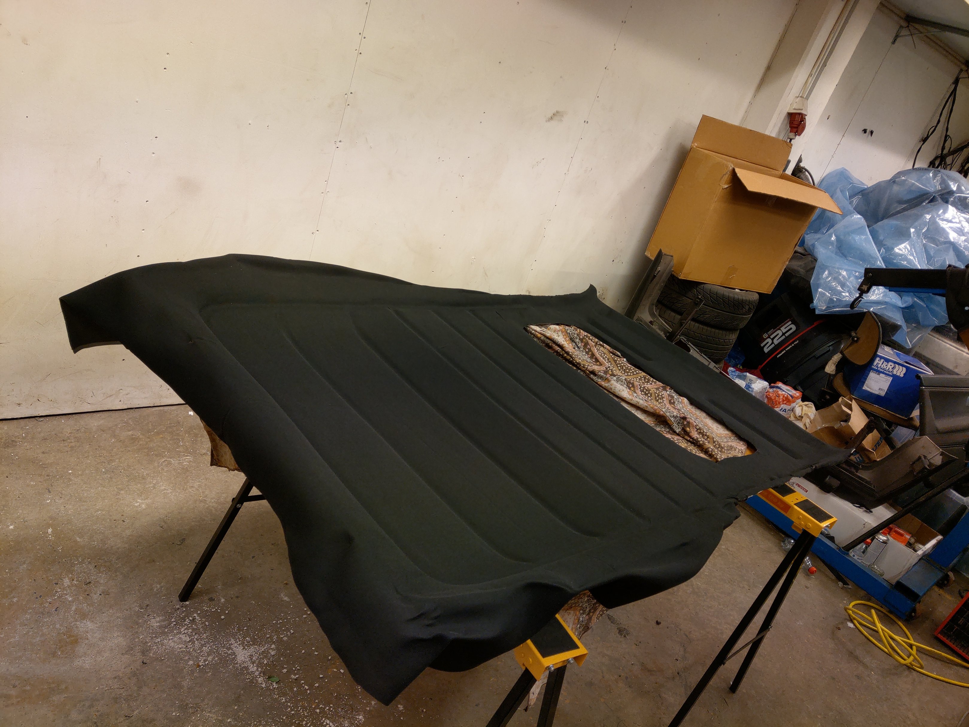 Börjar komma så pass långt nu så att det börjar bli svårt att skjuta upp att limma tyget på innertaket ;)
