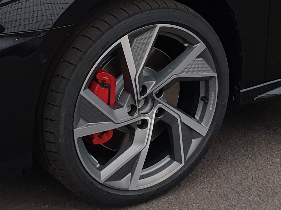 Synd bara att denna lider av samma "fel" som tidigare MQB bilar med tvådelade bromsskivor, nämligen att det sitter en vänsterskiva på båda sidorna av bilen (hålmönstrets riktning avslöjar detta). Hålmönstret i sig spelar ingen roll men som man kan se i bilen ovan är "kylflänsarna" i dessa skivor vinklade och på högersidan av bilen hamnar dessa i fel vinkel.