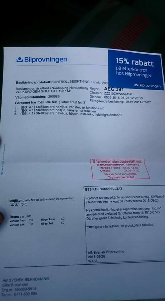 Besiktade bilen idag, kontakten till vänster framljus hade vibrerat ur. Ska till kompisens jobb och få strålkastarinställning så rullar den året ut. Tar med ägarpappren till bugrun ifall någon skulle vara sugen på att köpa den.