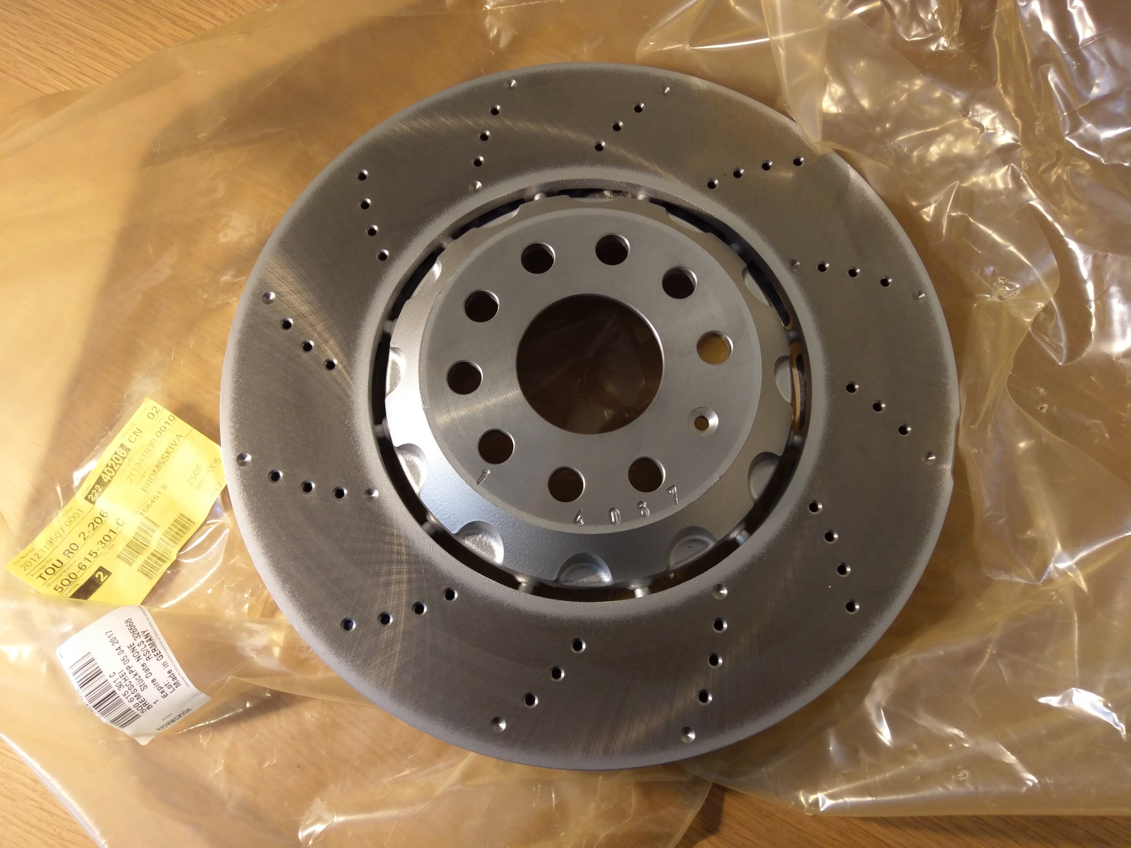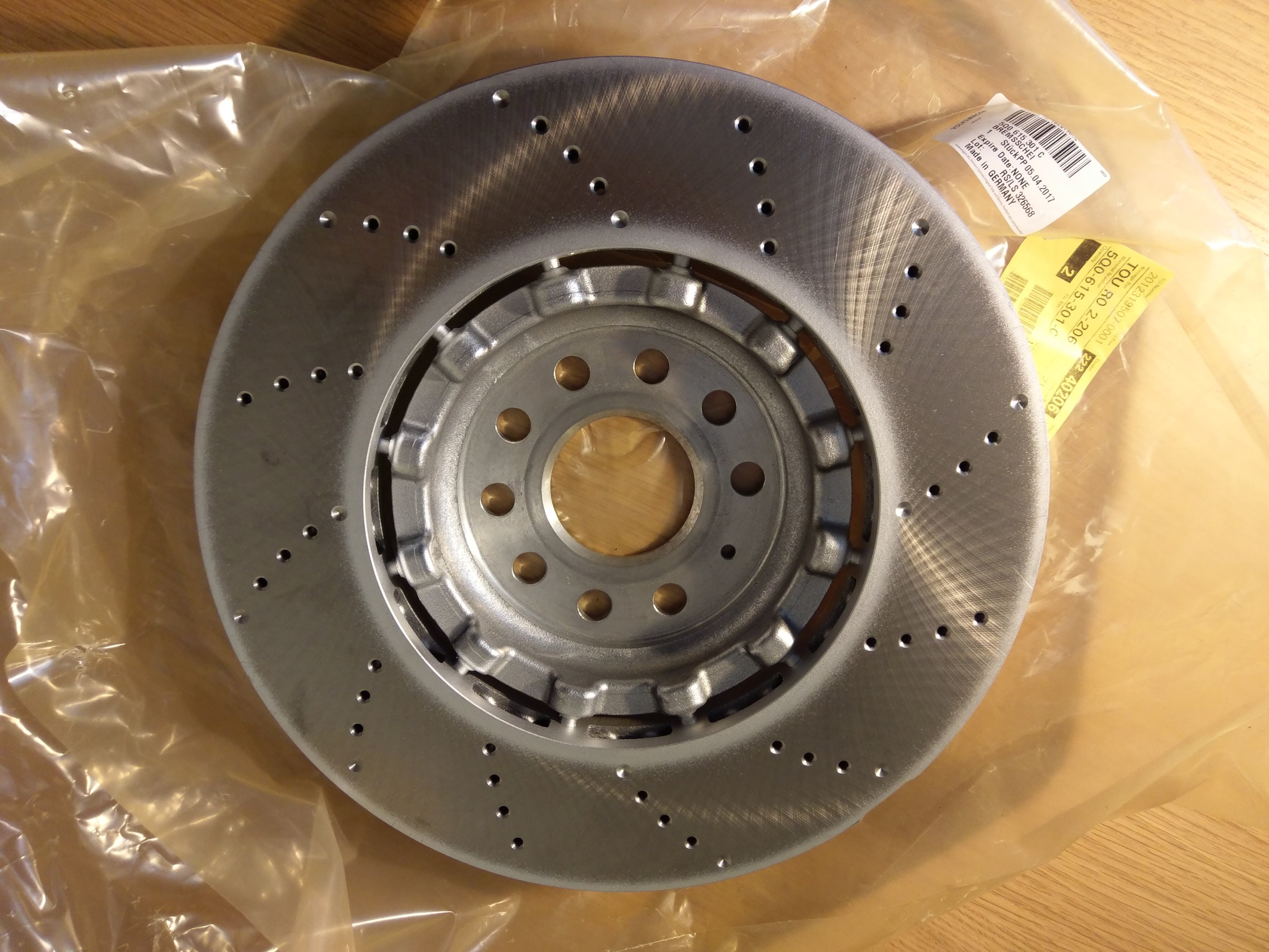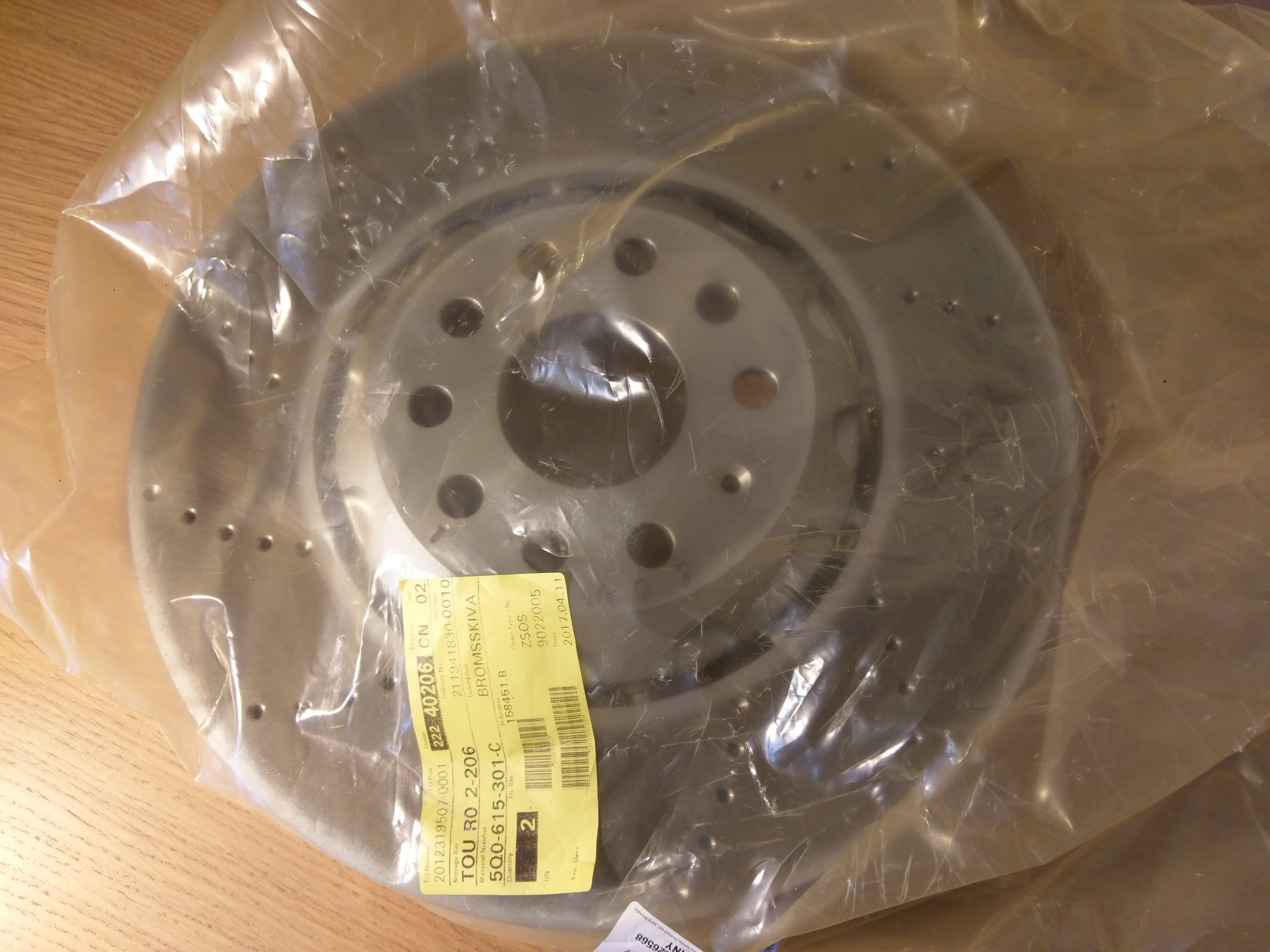 Beställde sen frambromsar till Clubsport S på VW, lättare och hålborrade skivor + belägg med annat mtrl. Har läst mig till att många tycker dessa är bra så det är värt att prova. Gillar inte original 340mm R bromsarna alls, varken i känsla eller damm-mängd....