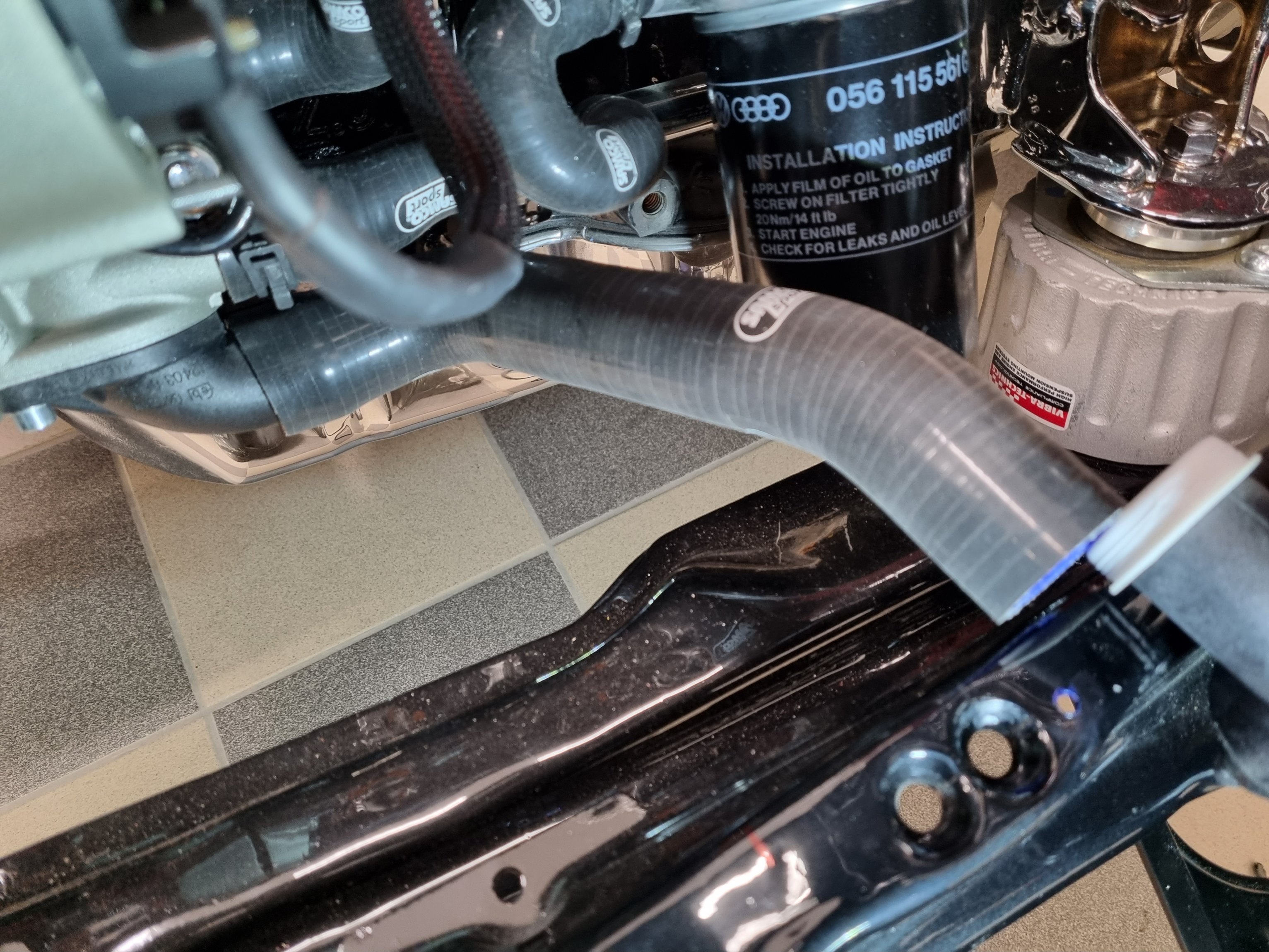 Så hur man än gör måste kylet flyttas. Tanken i kittet var att lossa kylet helt och flytta det framåt och neråt ganska mycket så det hamnar framför kylarbalken precis innanför grillen. Man skulle då borra en massa hål i fronten och bulta fast kylet mha 4 konsoler som skulle skruvas i hålen för luftstyrningarna. Gillande inte alls att borra sönder min nya VW org front och är tveksam till att hänga upp kylaren i hål endast av sedda att hålla små plastbitar. När man flyttar kylet så passar inga kylarslangar heller och de som följde med kittet luktade mer än lovligt biltema-lösning med fula universal-spiral-slangar som jag har väldigt dålig erfarenhet av.