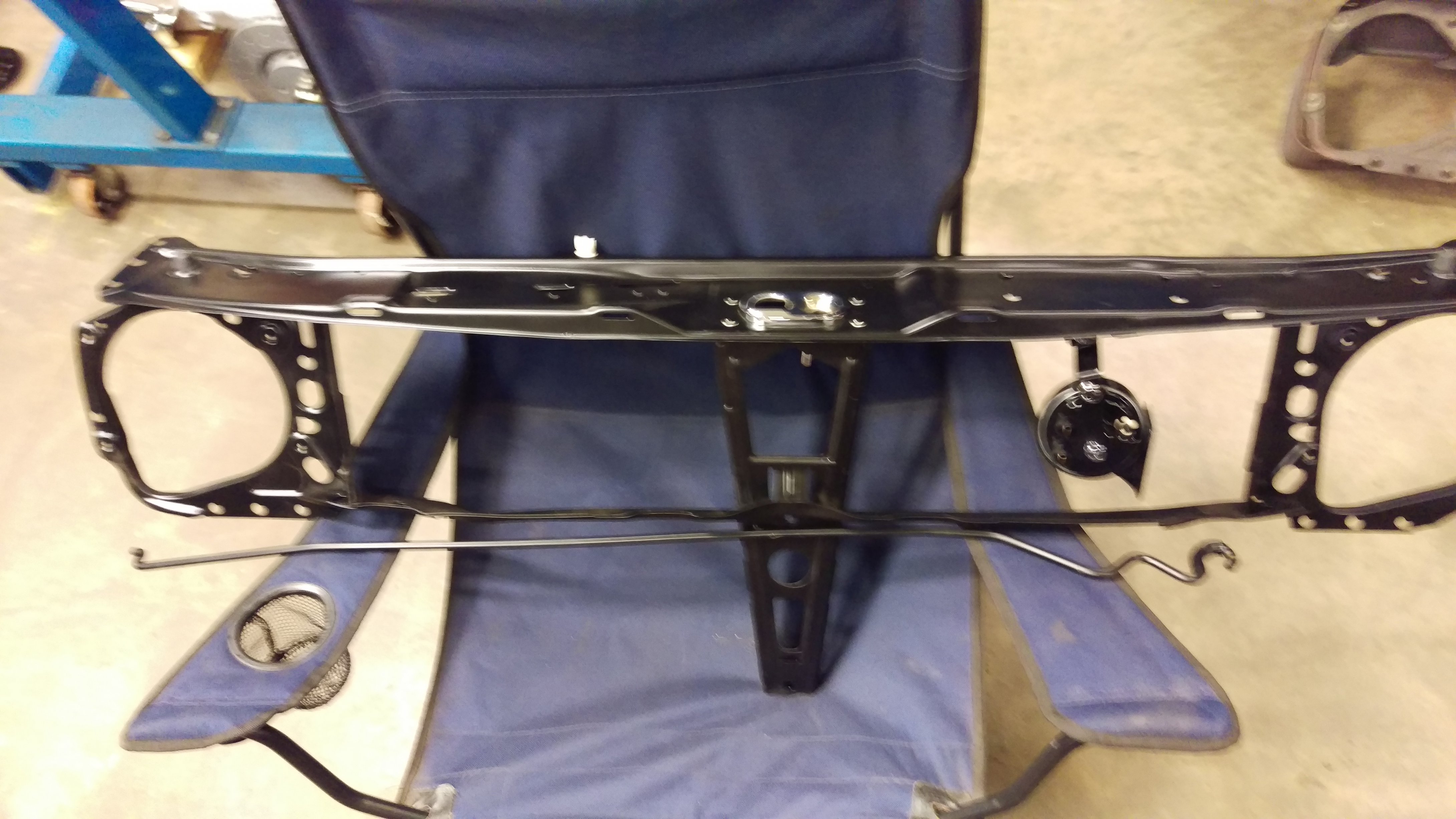 Mina skruvar var inte klara denna veckan heller så det fick bli mera förberedelser för frontmontering. Köpte en ny VW original front 2005 som legat på hyllan sen dess, denna slipade jag ner och lackade först med 2K expoxyprimer och sen med halvmatt 2K färg. Litar inte på VW:s svarta färg som är på det mesta, rostar på bara några år... I bakgrunden syns den gamla balken som både var rostig och bucklig efter tidigare ägares krockar: