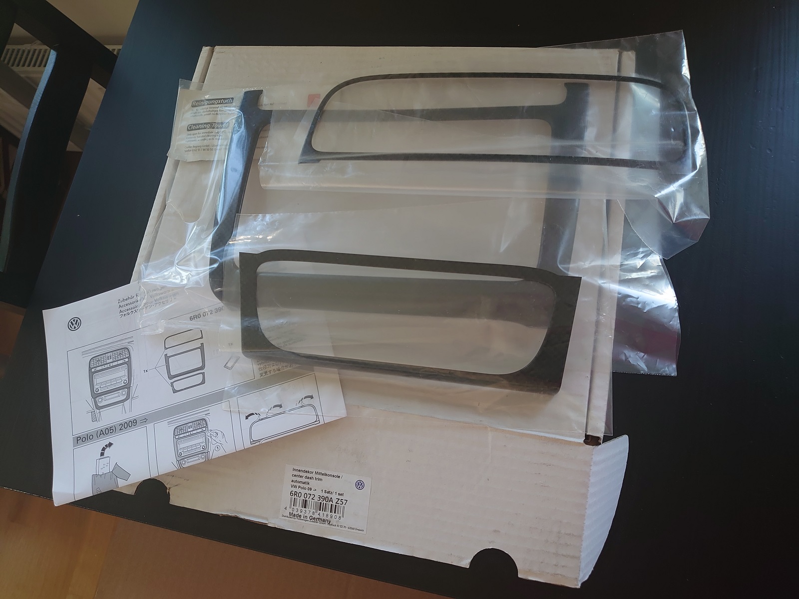 Den andra lösningen hittar man i originaltillbehörskatalogen, där fanns nämligen också kolfiberlook-dekor. Hittade en sån sats till OK pris på nätet, fick hem den idag, ny i originalförpackning. Till skillnad från min nuvarande lösning är detta ingen tunn 2D-film, utan ett någon millimeter tjockt "skal" som klistras på med tunn dubbelhäftande tejp. Det är färdigt "3D-format" med en läpp längs kanten för att det ska täcka panelen även längs kanterna, och ska därmed hindra att panelens originalfärg lyser igenom nånstans.