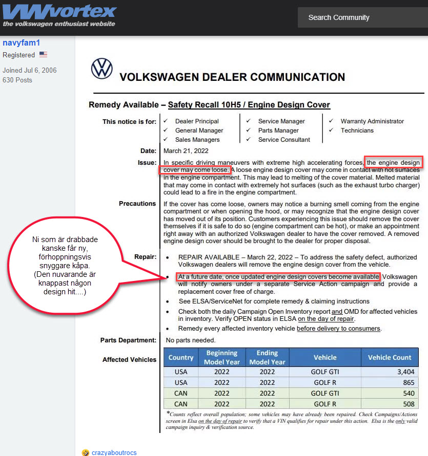 En skillnad jämfört med mk7 EA888 motorkåpa är att mk8:ans är mer omslutande mot front och torpedvägg där turbon sitter. Bieffekten kan blivit mindre ventilation under kåpa samt stigande temperatur vilket orsakar eventuell risk för överhettning gissar jag.. Därför vill man för säkerhets skull ta bort den helt tills ny lösning är tillgänglig. På mk7 finns ljudisolering med på undersidan av kåpan vilket dämpar en del.