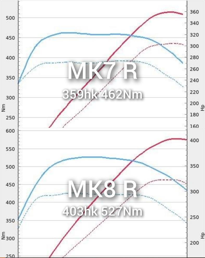Men 98 oktan mapp är ju var 95% väljer, och de ser ju galet lovande ut.. Det tar ju ut drygt 400hk och drygt 500Nm på bara steg 1. Så det krävs tom att man gör en TCU mapp. För att DSG har 500Nm som som max kopplingstryck som Mk75 hade.. Men nya Turbon ger så mkt mer vrid om man vill ;)