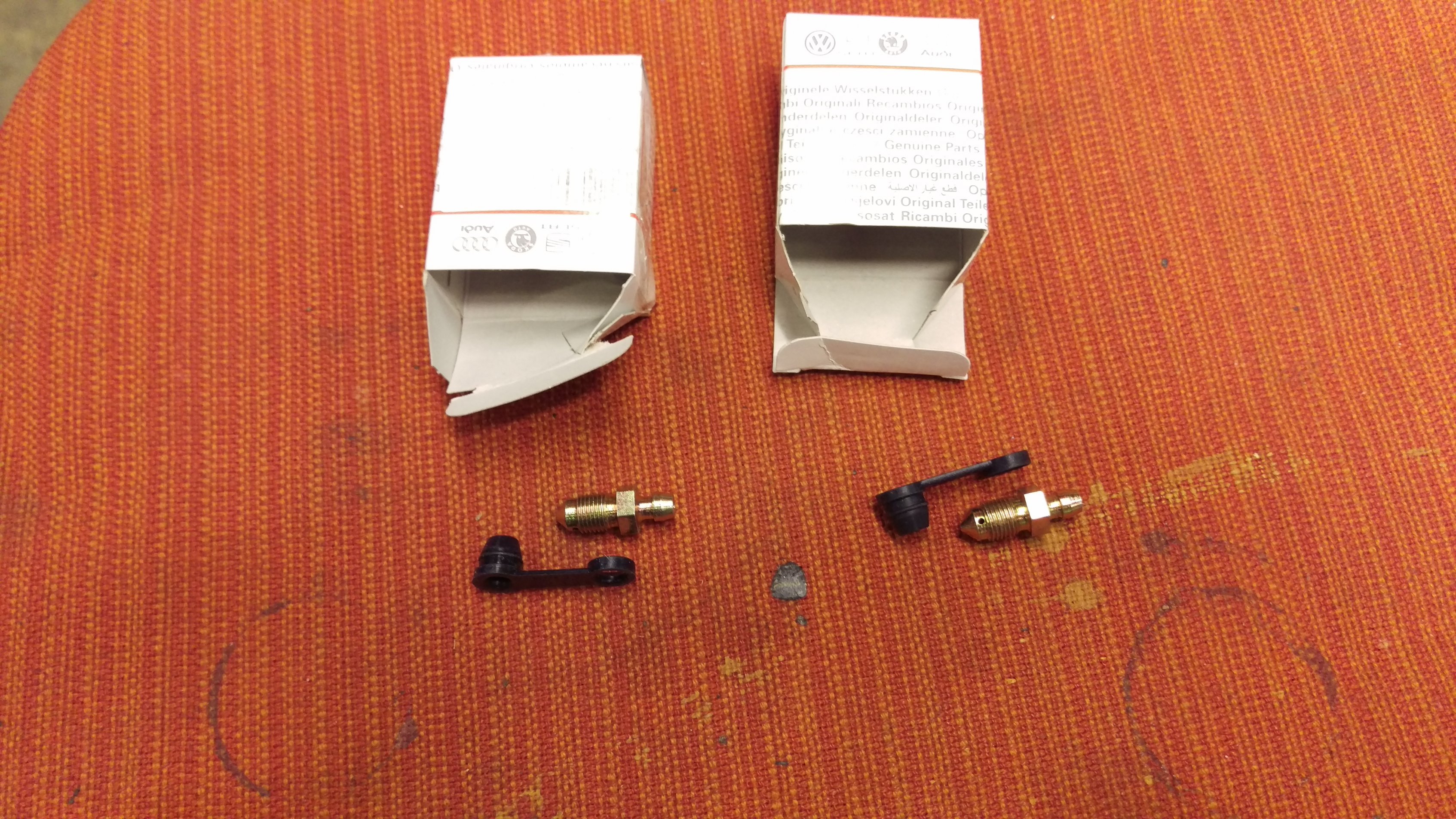 Tack all ni som gissade, synd att ingen av er jobbar på VW:s ekonomiavdelning. De 2 paketen innehållande totalt 2 luftningsnipplar och 2 gummihattar kostade 1260kr!!! Jag har gjort många dåliga köp map bilar genom åren men detta är definitivt en av de sämsta.... Man kan ju inte ångra sig heller när man specialbeställt från Spanien. Men min reservedelskille på VW skrattade gott iaf så jag bidrog till att förgylla hans dag :)