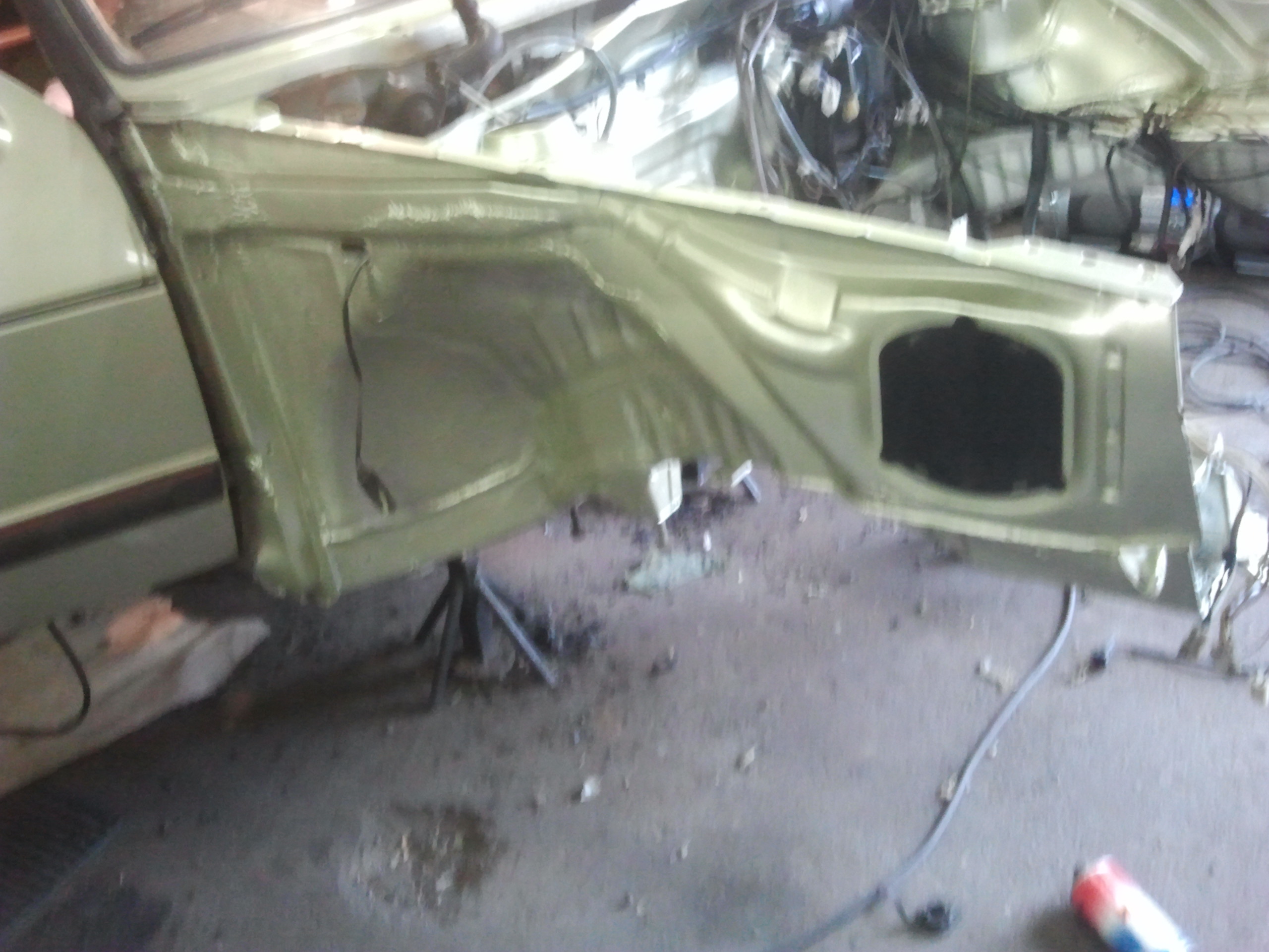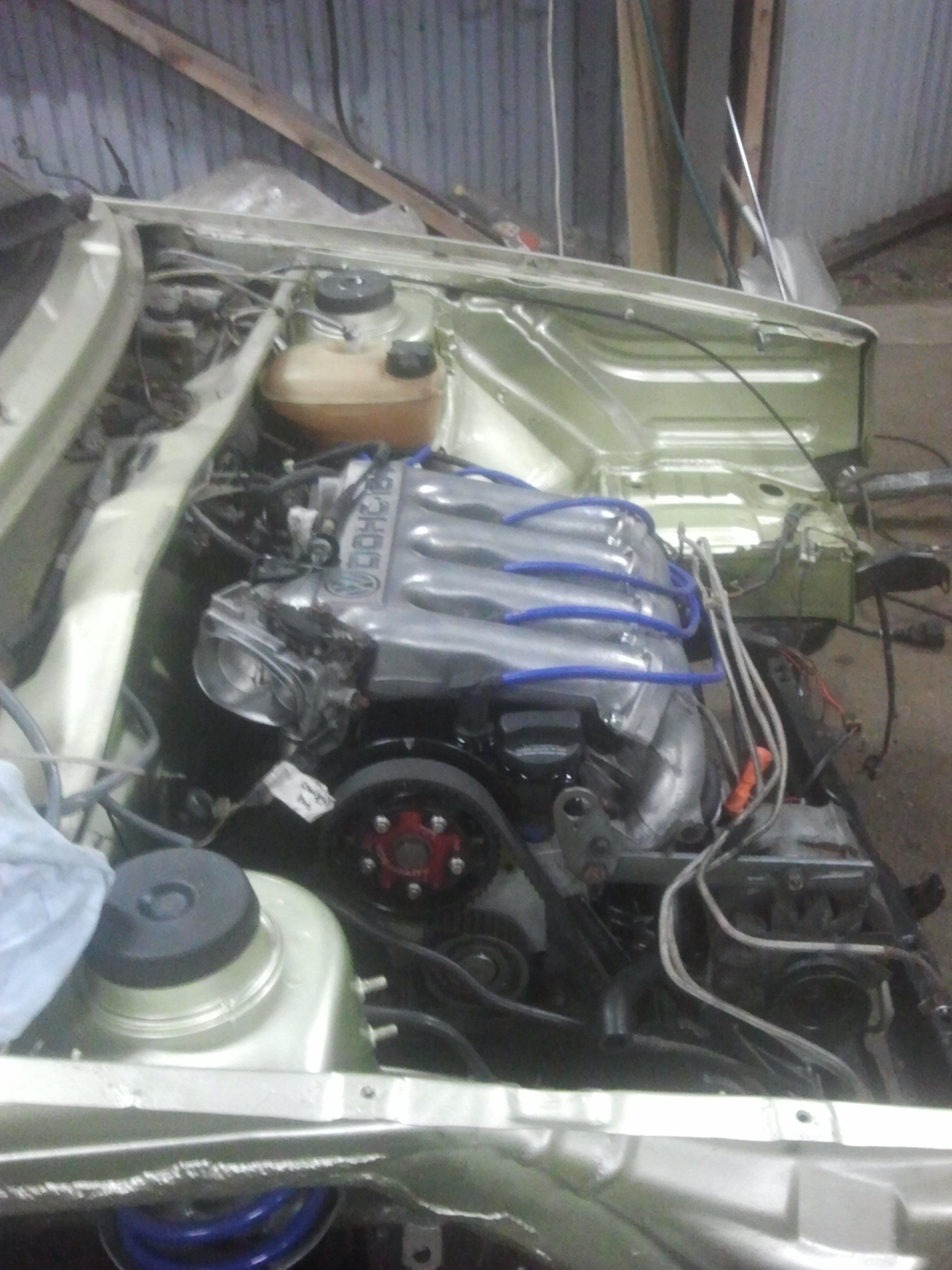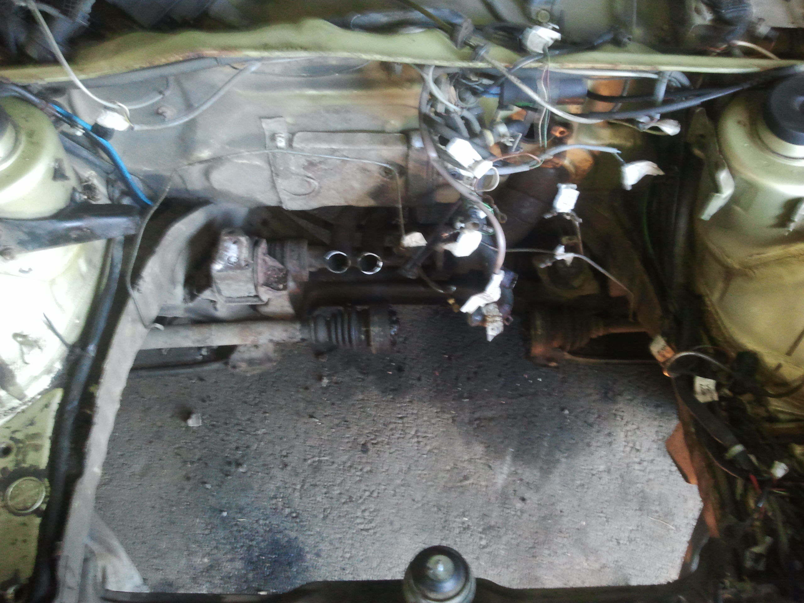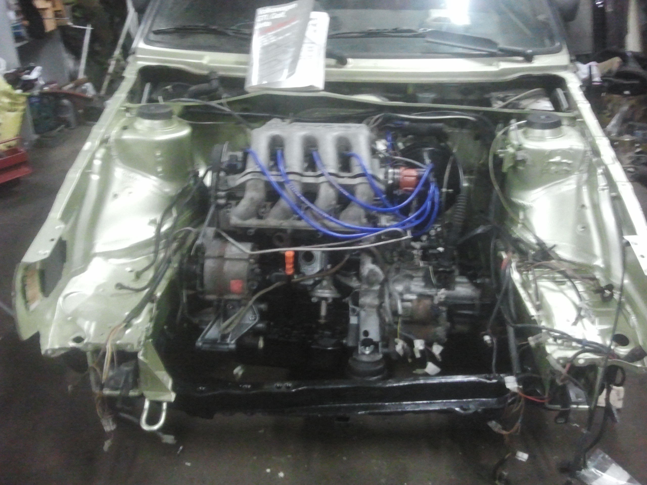 Började med att ta bort allt runt motorn för att kunna lyfta ur den, inte kul när ventilkåpspackningen har spottat olja och bilen stått i en lada i 10 år. Efter att motorn var ur gick jag på hjulhusen fram och letade rost. Hittade nästan inget alls till min stora förvåning, bara att rostskydda och lacka igen.
