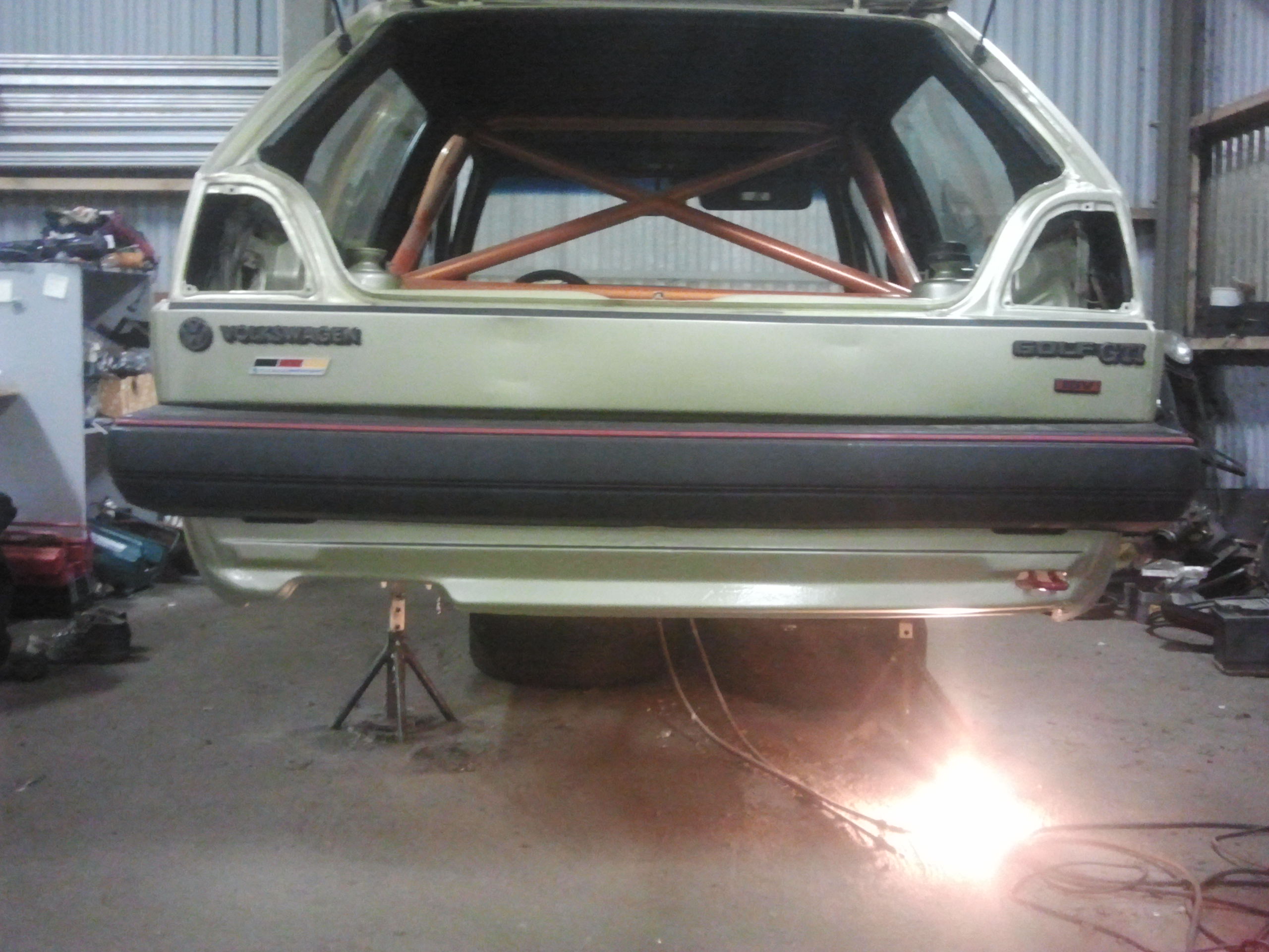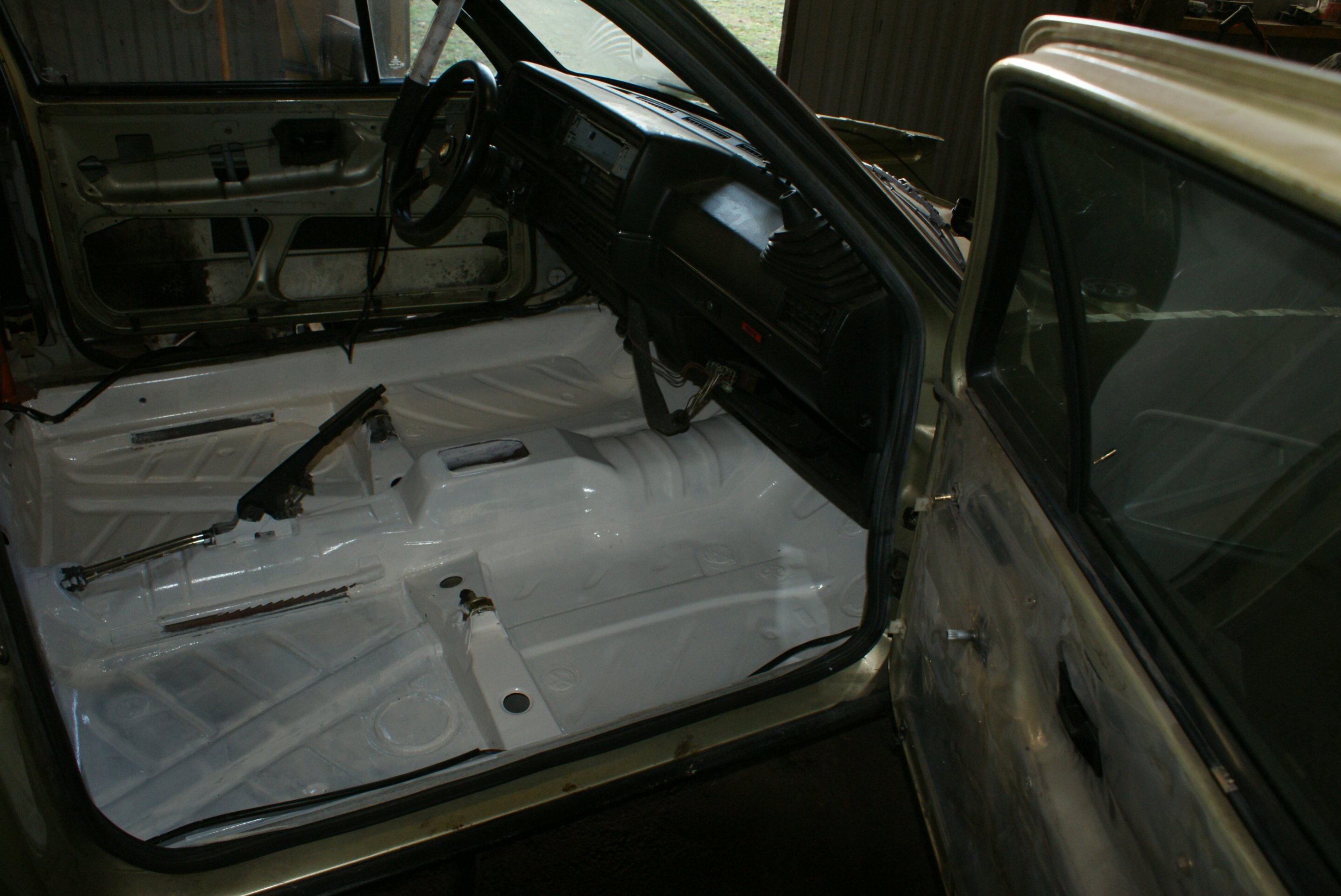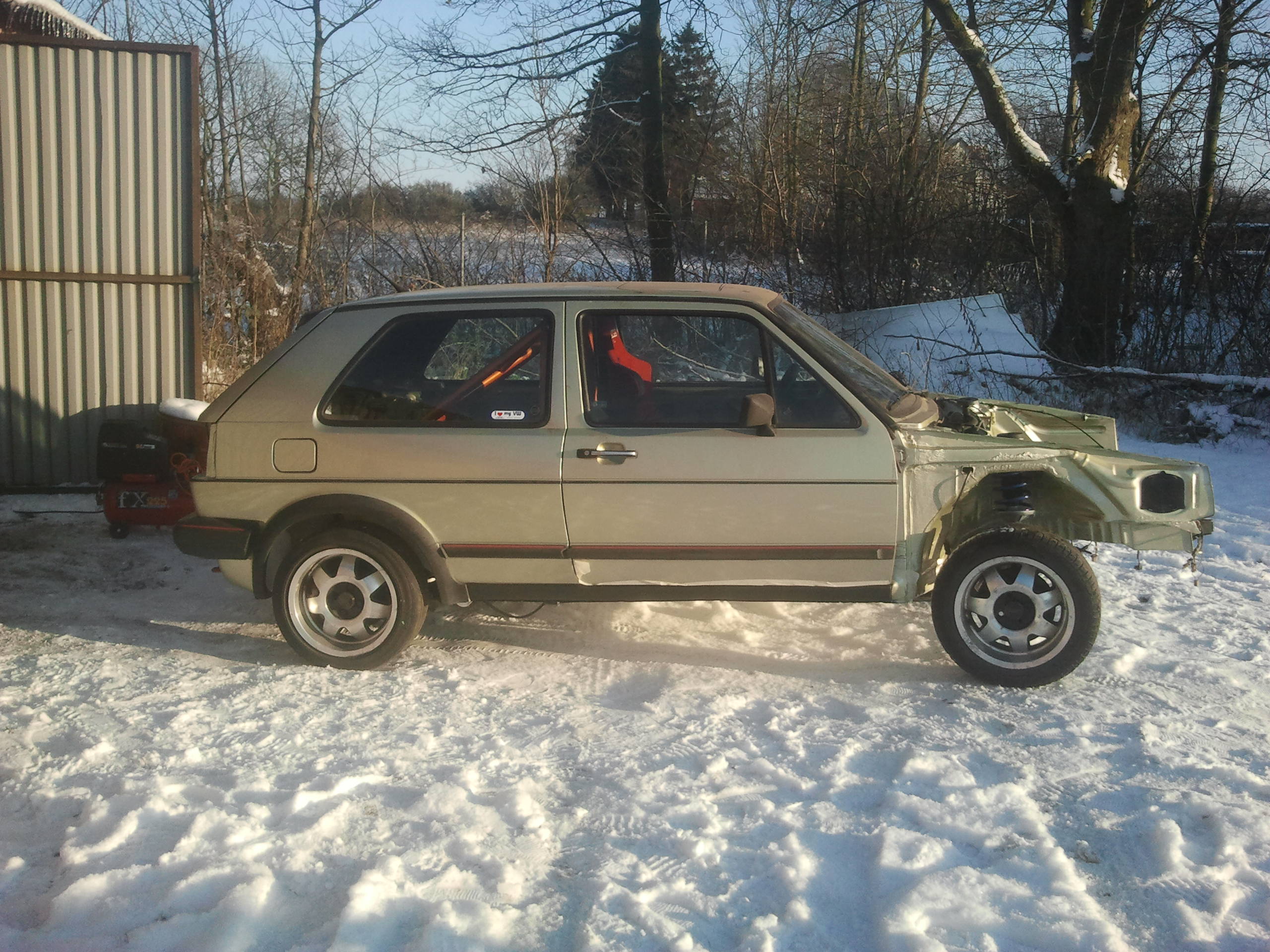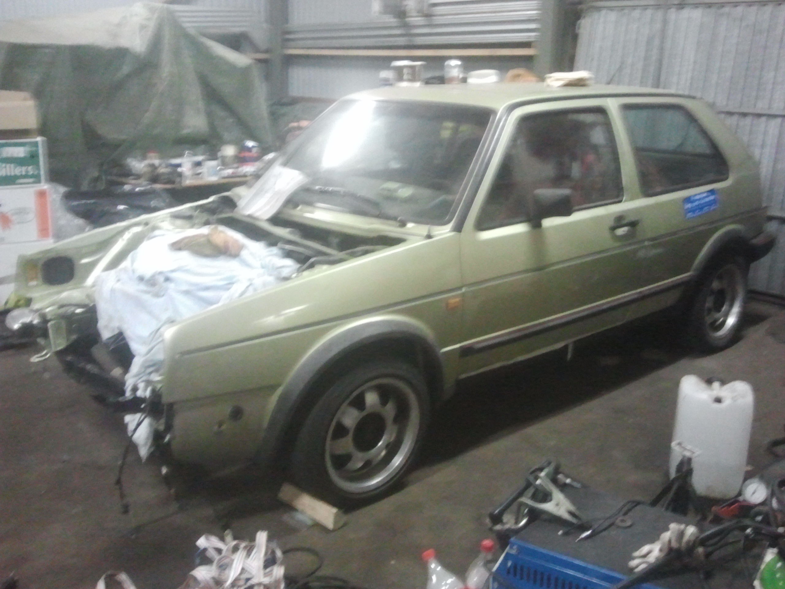 Nu när kylan börjar tränga sig på ute i garaget tyckte jag det var läge att starta en projekttråd! Bilen i fråga var ett rent impulsköp i juli i år som vid det här laget har tagit sig oanade proportioner för mig... Det är en Gti 16v kr från 86 i den klassiska färgen "racing grün". Den hade gått 24xxx mil och var förånansvärt rostfri och kändes väldigt fräsch. Tänkte egentligen köra sommaren ut med bilen men när en krets i huvudbromscylindern packade ihop så åkte den in i garaget redan 3 veckor efter köpet.