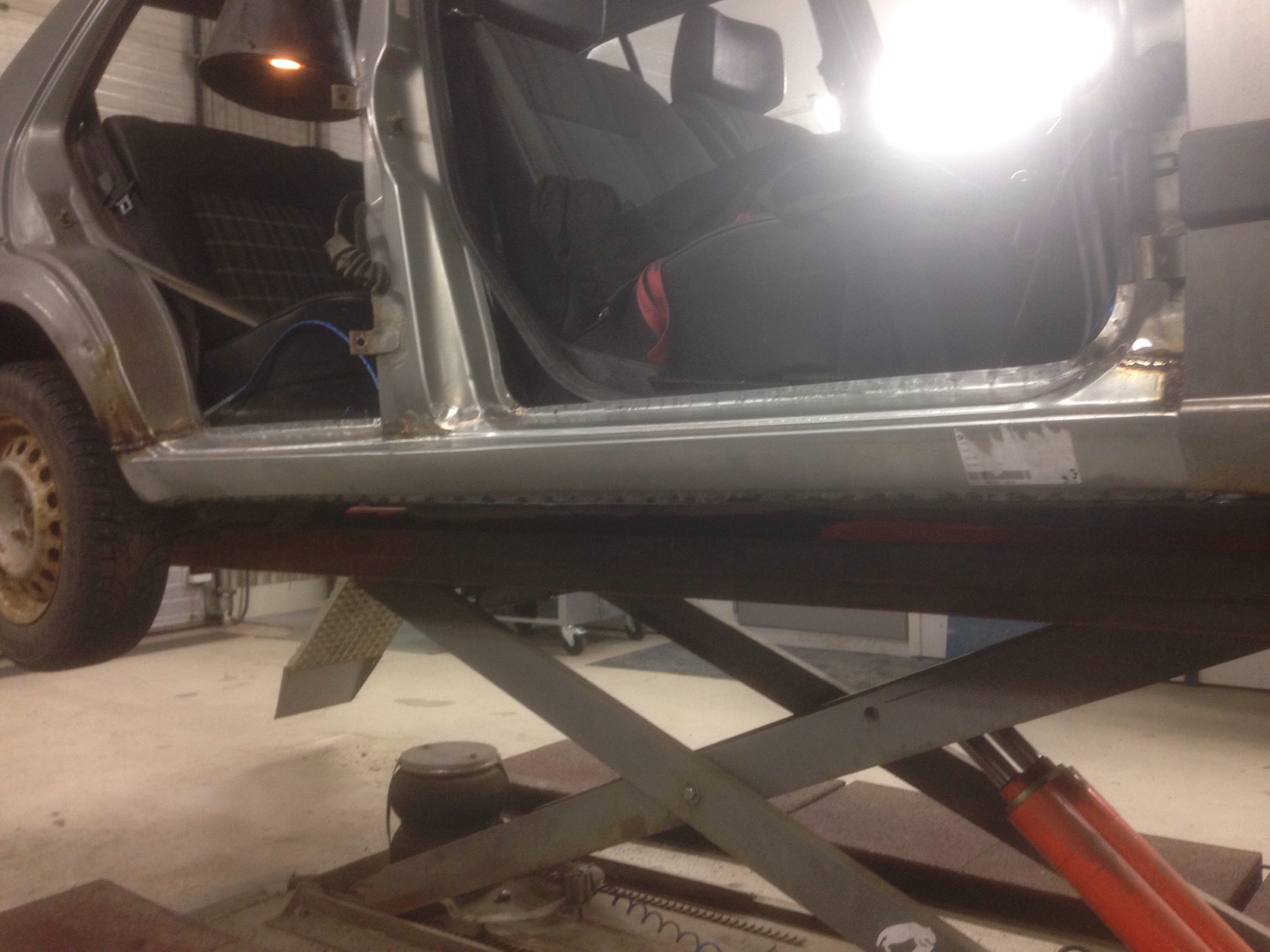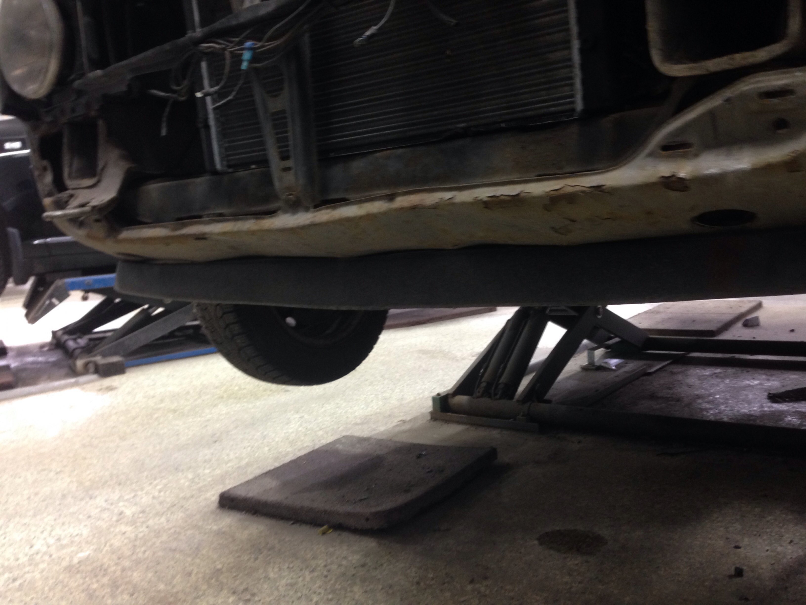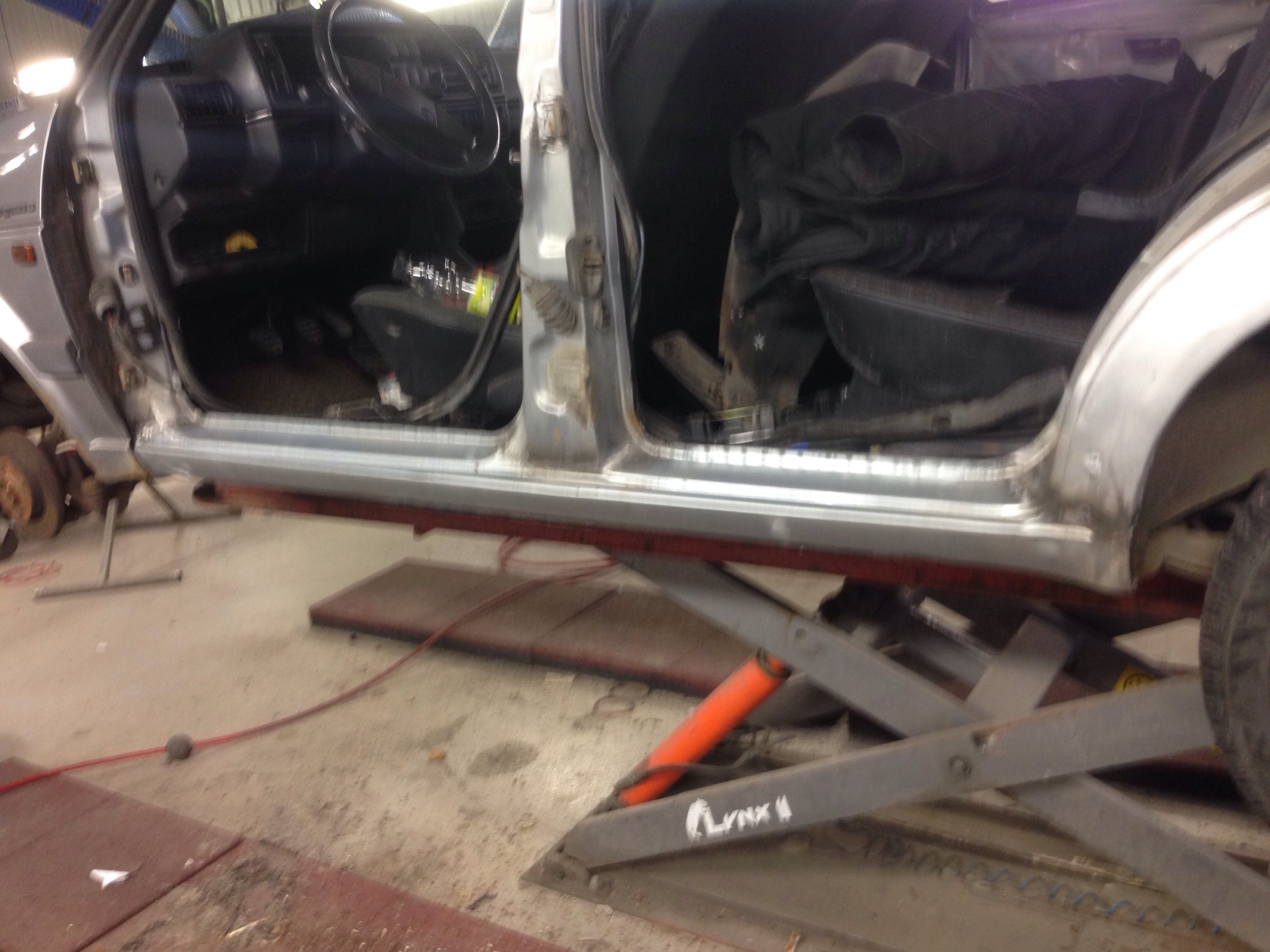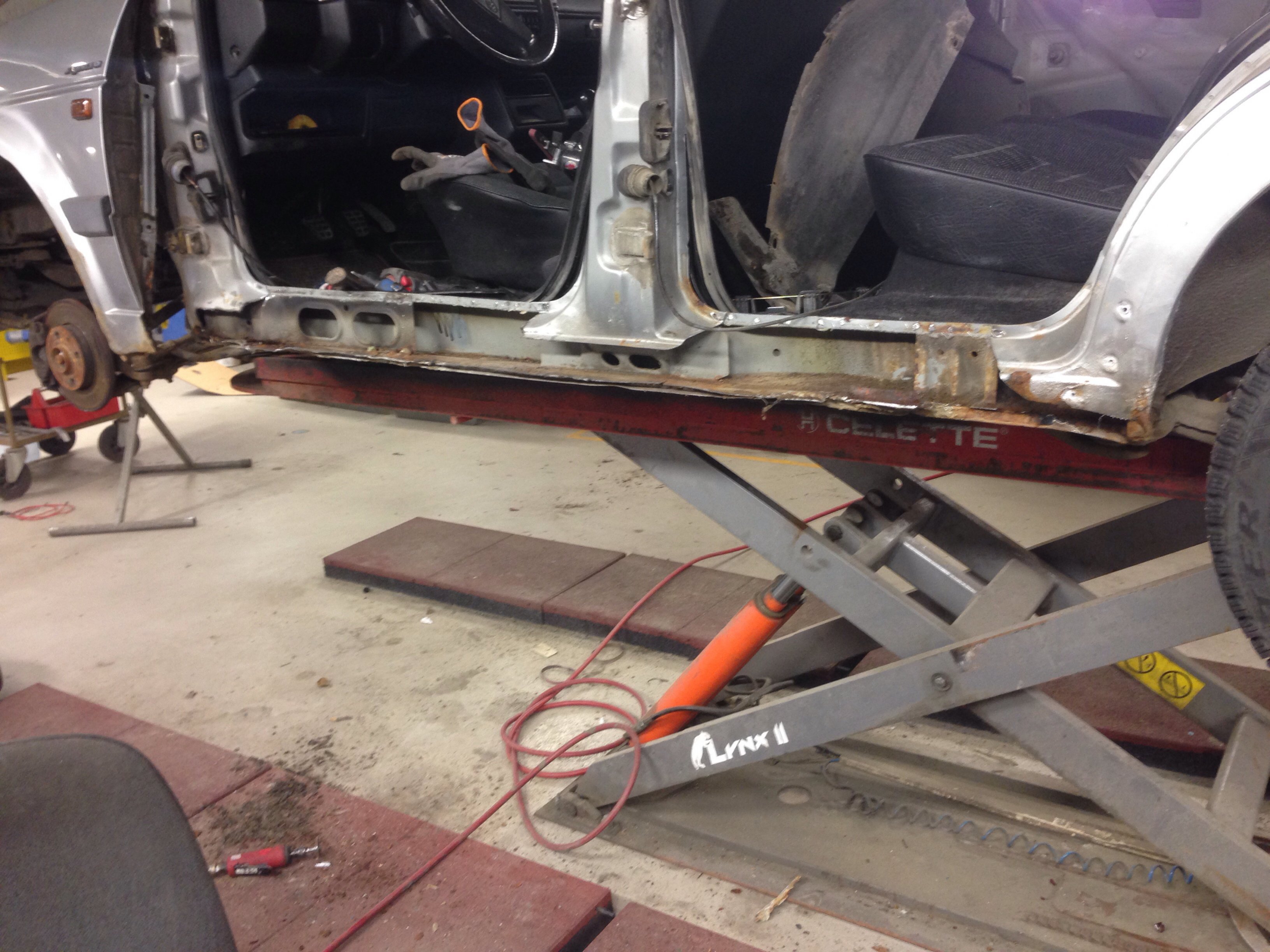 Men karossen är i mindre bra skick, nog byte på båda trösklarna, små hål i både fram & bakskärmar, lite buckor i huv & dörrar = mycket jobb...